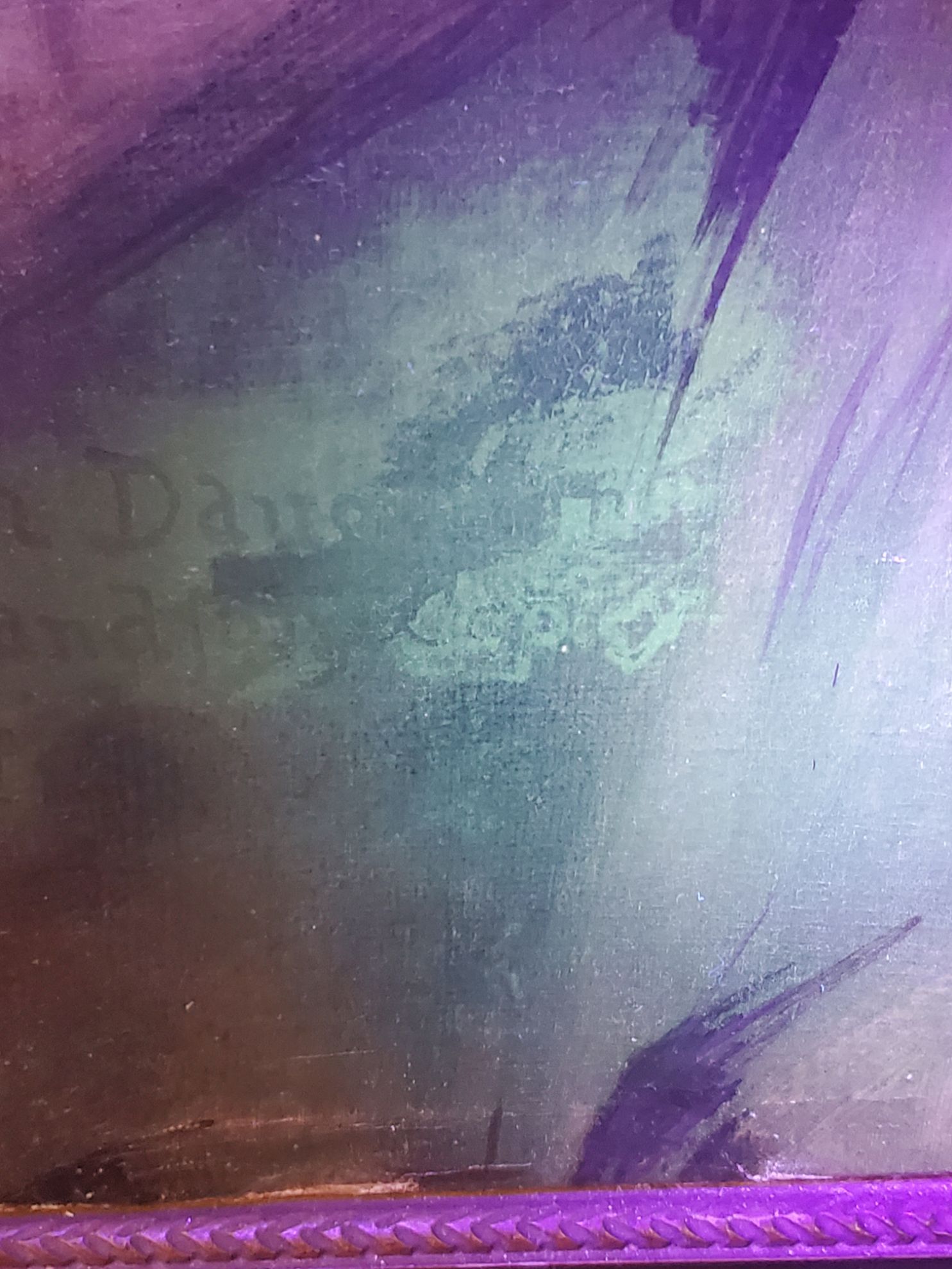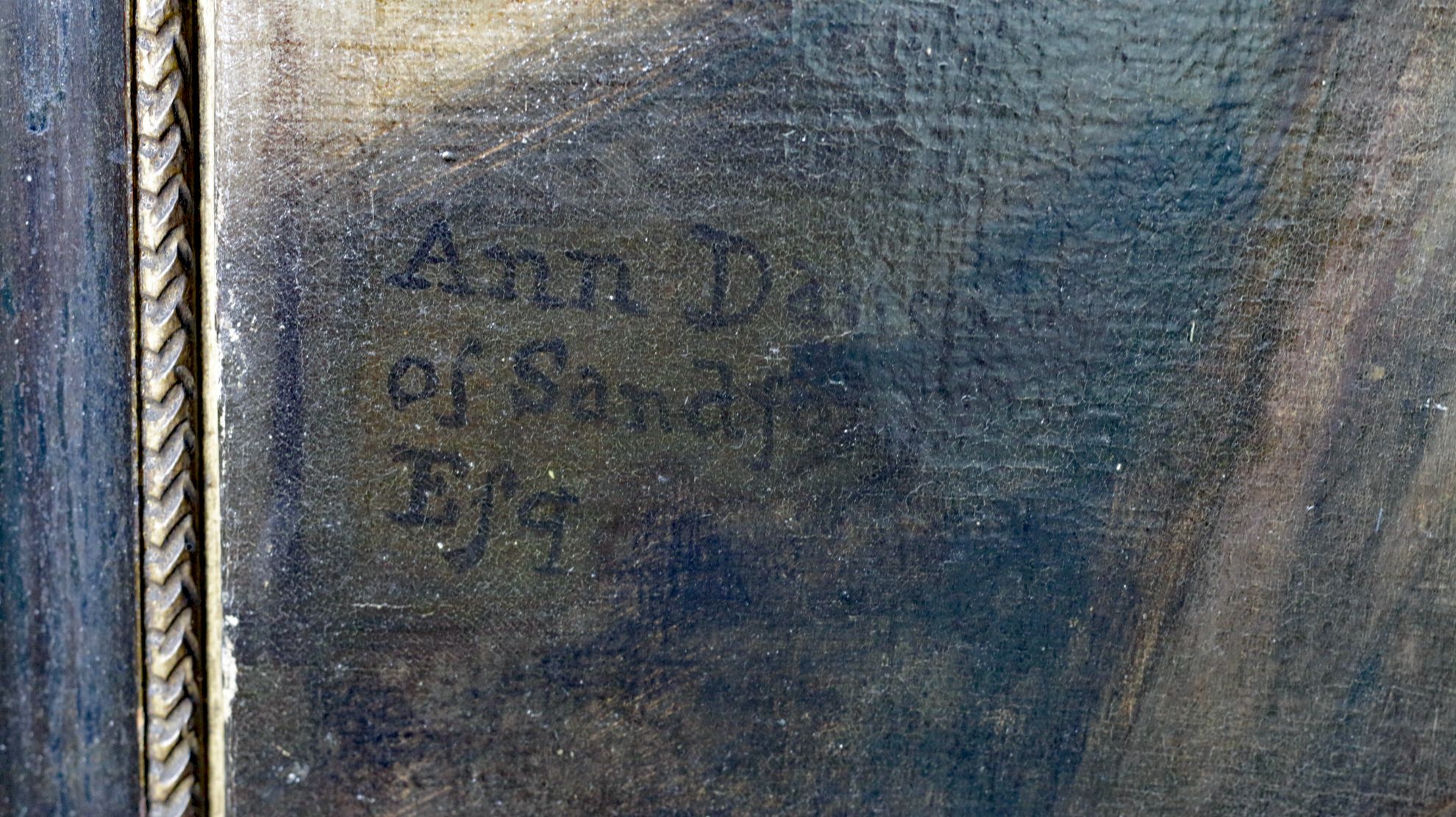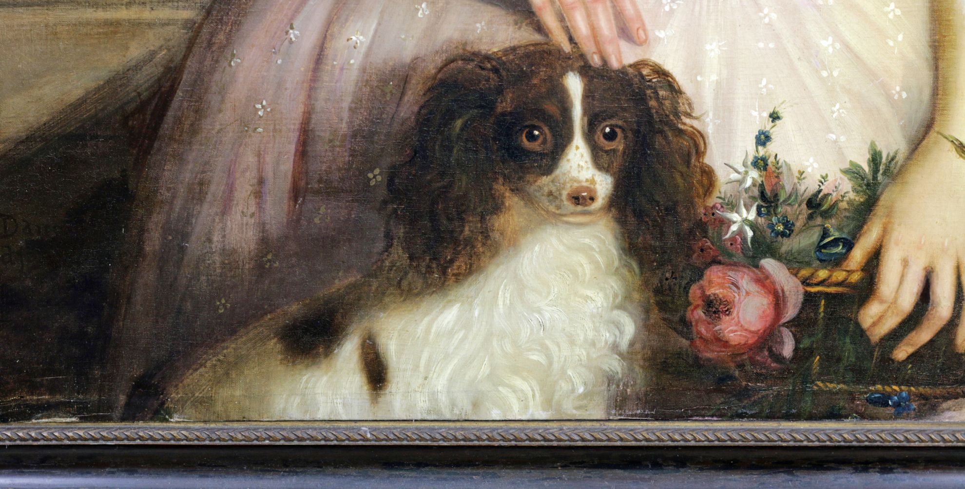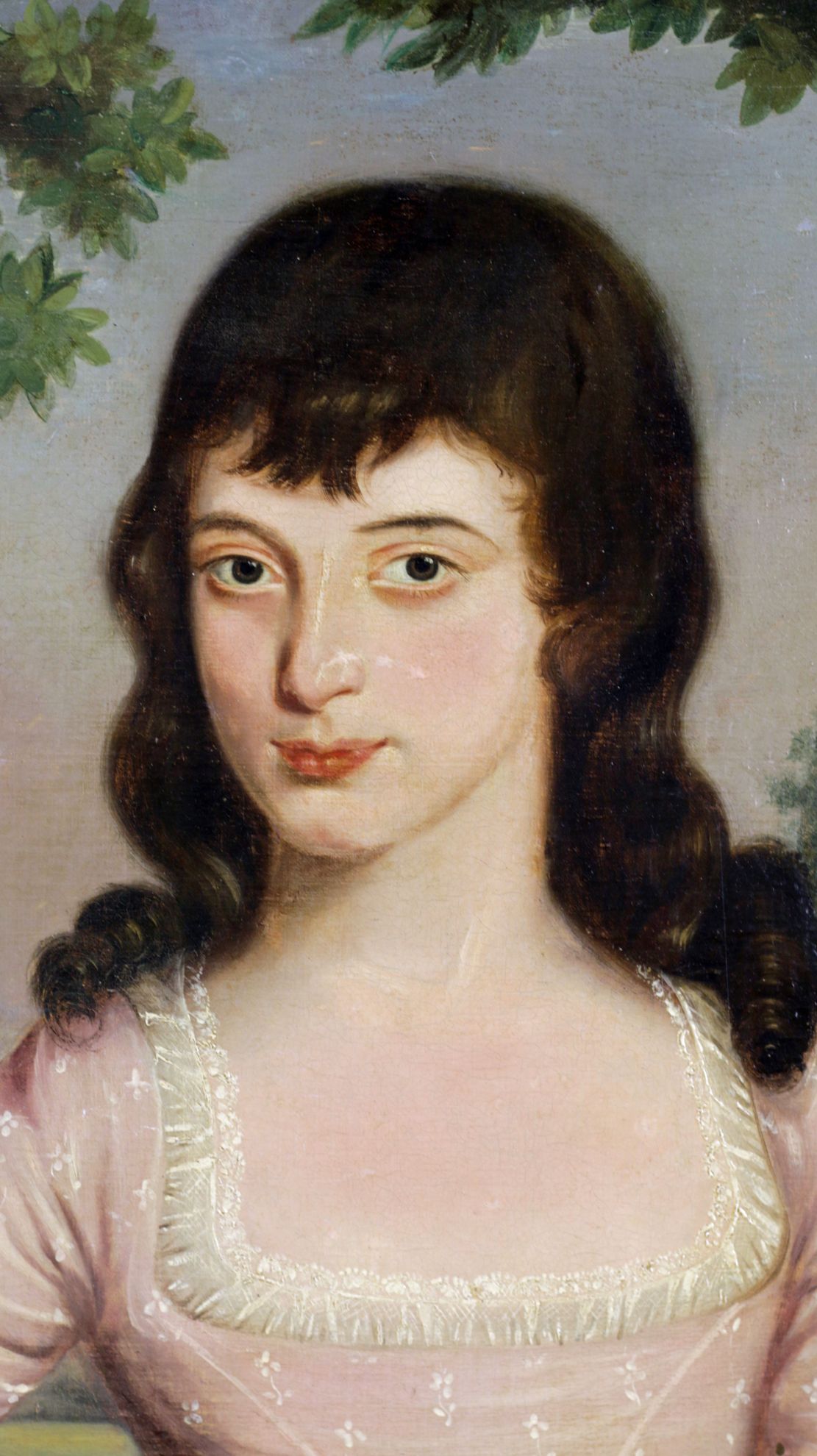 OverviewOil on canvas portrait depicting a young woman identified by inscription as Ann, Daughter of Sandfor Copley, Esq. The sitter appears seated in a pastoral landscape beneath a tree, accompanied by a small spaniel and holding a basket of flowers. Classical architectural elements appear at left with an open landscape beyond. The composition reflects late eighteenth century Anglo-American portrait conventions with neoclassical influence and pastoral symbolism.Dating / BackgroundBased on costume, hairstyle, and compositional structure, the painting aligns with late eighteenth century American portraiture, likely within the Federal period. The pink empire-style dress with sash, soft pastoral landscape, and symbolic dog companion reflect aesthetic tendencies found in Anglo-American portrait painting of the late eighteenth century. An inscription visible in the lower portion reads Ann Daughter of Sandfor Copley Esq. Portions of the inscription are obscured by age and restoration, but the lettering appears period and was likely intended to identify the sitter. Further genealogical research may clarify the identity referenced in the inscription.Why CollectEighteenth century American portraiture represents an important category of early American material culture. Portraits with period inscriptions are particularly desirable as they may provide avenues for genealogical research and historical attribution. The combination of sitter portrait, pastoral landscape, companion animal, and architectural motif presents strong decorative presence while also offering potential historical significance.Dimensions (inches)Height: 43.75Width: 36.25Depth: 1.25ConditionProfessional restoration performed in the 1980s including lining and areas of inpainting. Surface displays expected age related craquelure and scattered retouch consistent with conservation work. Varnish shows mild discoloration and surface wear consistent with age. Frame displays edge wear and minor corner separation typical of age.