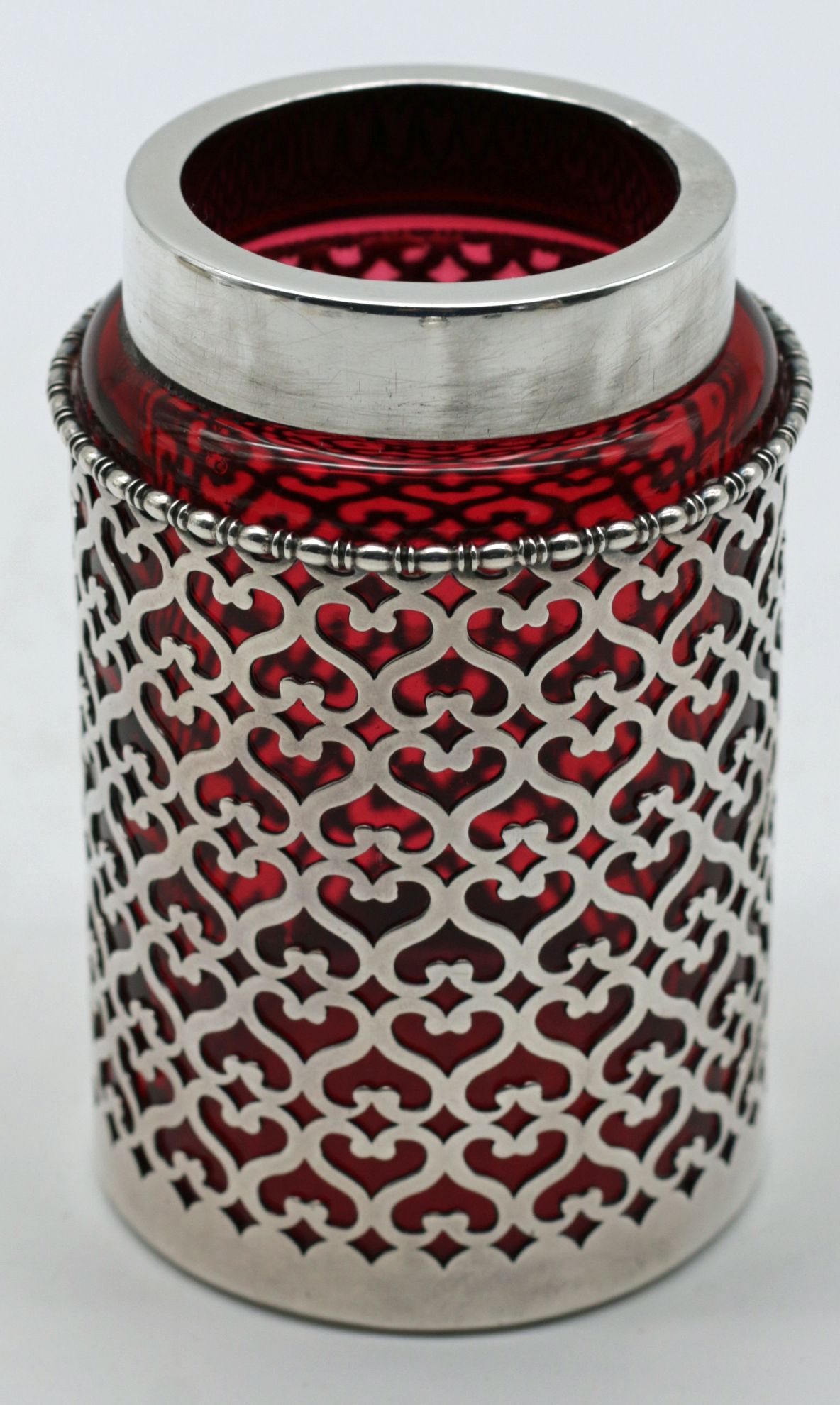 OverviewSterling silver overlay muffineer with a cranberry (ruby) glass insert, housed in an openwork cage with repeating heart-and-scroll elements and beaded rim accents. The pierced dome shaker top is monogrammed and lifts for filling. Medium: sterling silver (overlay and cap) with colored glass insert. Style: late Victorian to Edwardian table silver, decorative openwork overlay.Dating / BackgroundMuffineers were specialized shakers used for powdered sugar service and related table use, popular from the late 19th century into the early 20th century. Cranberry glass (gold-ruby coloration) remained a favored decorative choice for small table objects. The overlay technique here reflects early 20th century decorative silverwork, pairing bright sterling with a vivid colored glass core. A mark reading "Sterling 2 24" is present (sterling purity with a likely pattern or production code).Why CollectAn appealing combination of precious metal and richly colored glass in a compact form. Overlay muffineers display well in a cabinet or bar or tea vignette and still function as a classic shaker for sugar or spice. The openwork design keeps the cranberry glass visually dominant while adding texture and sparkle from the silverwork.Dimensions (inches)Height: 5 3/8Width: 2 1/2Depth: 2 1/2ConditionOverall very good condition. Glass shows light surface wear consistent with age and handling; no visible cracks noted. Sterling overlay retains strong form with light scratches and scattered shallow dents; the most noticeable denting appears on the domed top. Monogram engraved on the top; please review photos for detail.