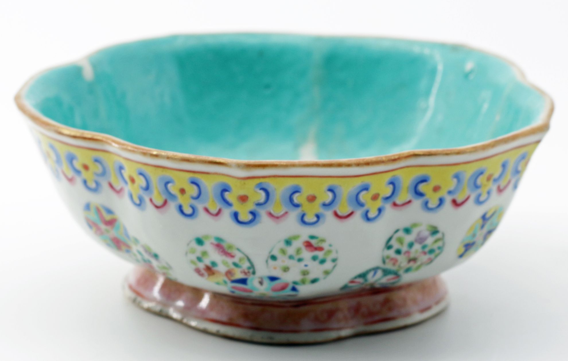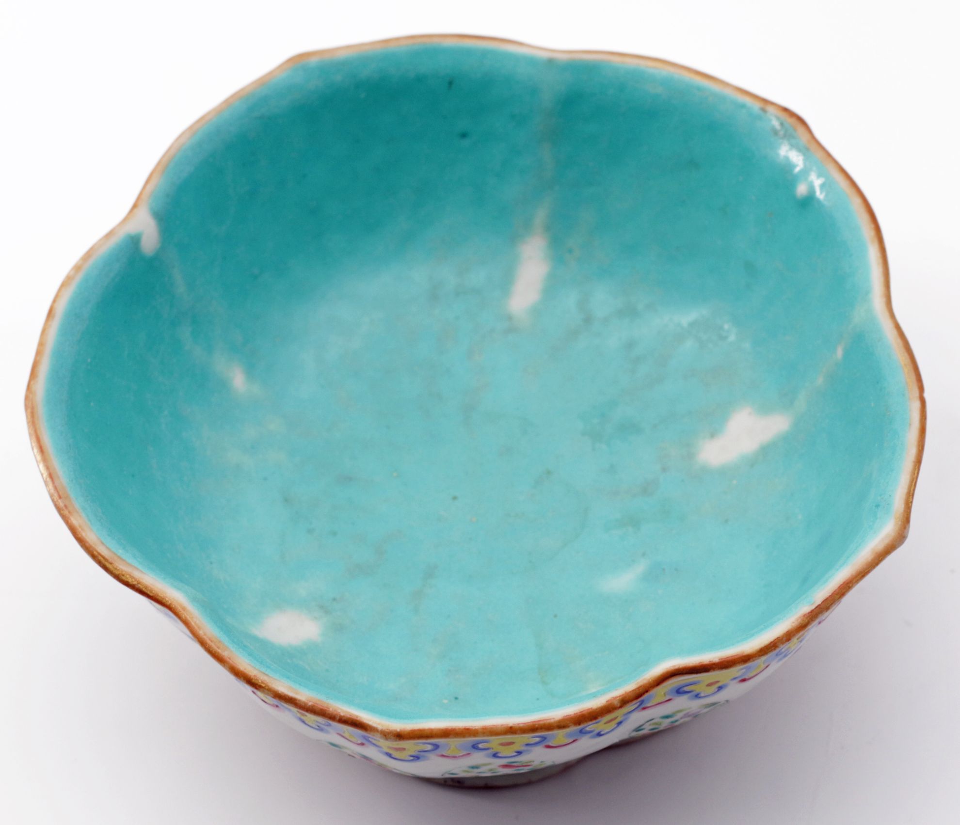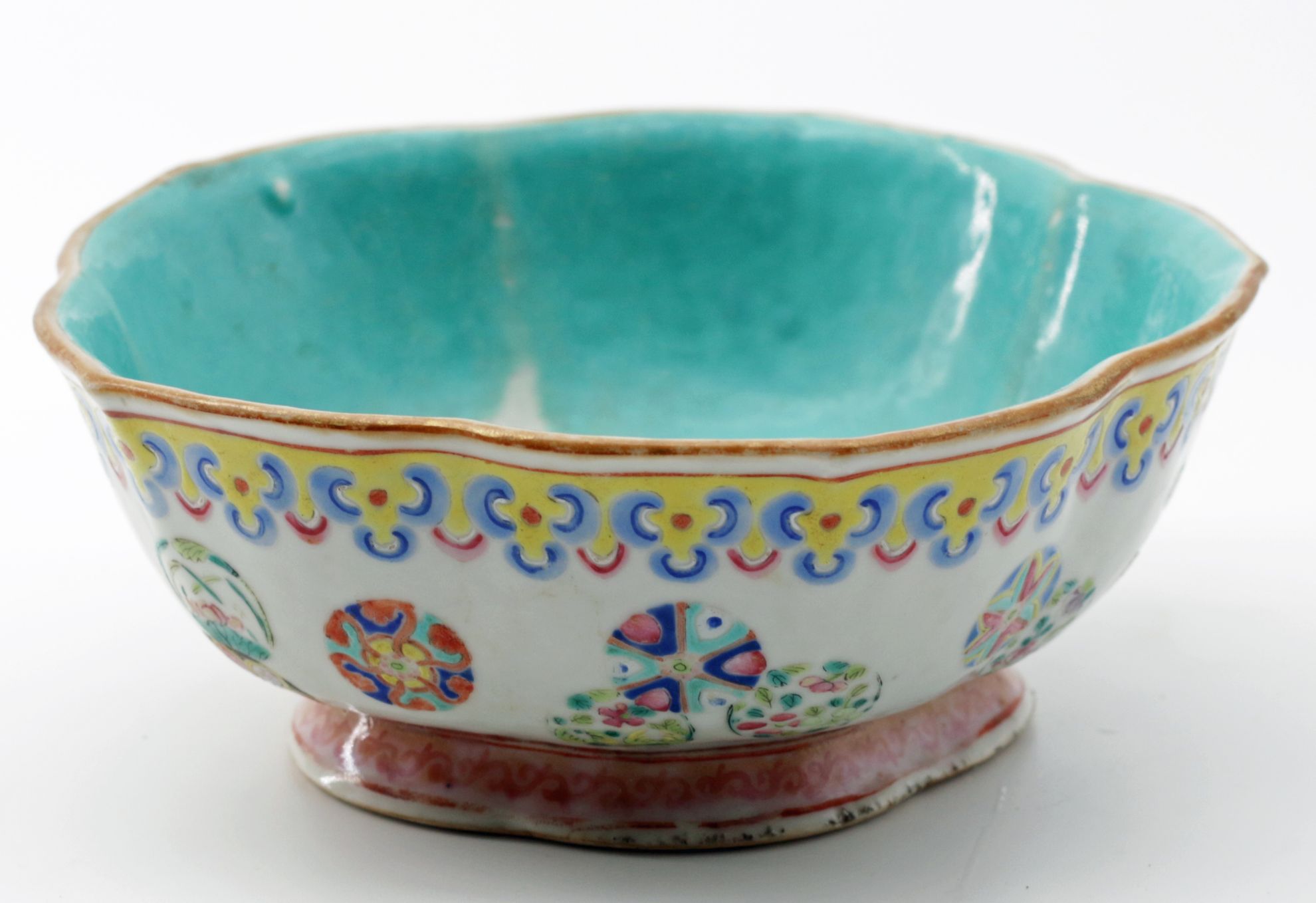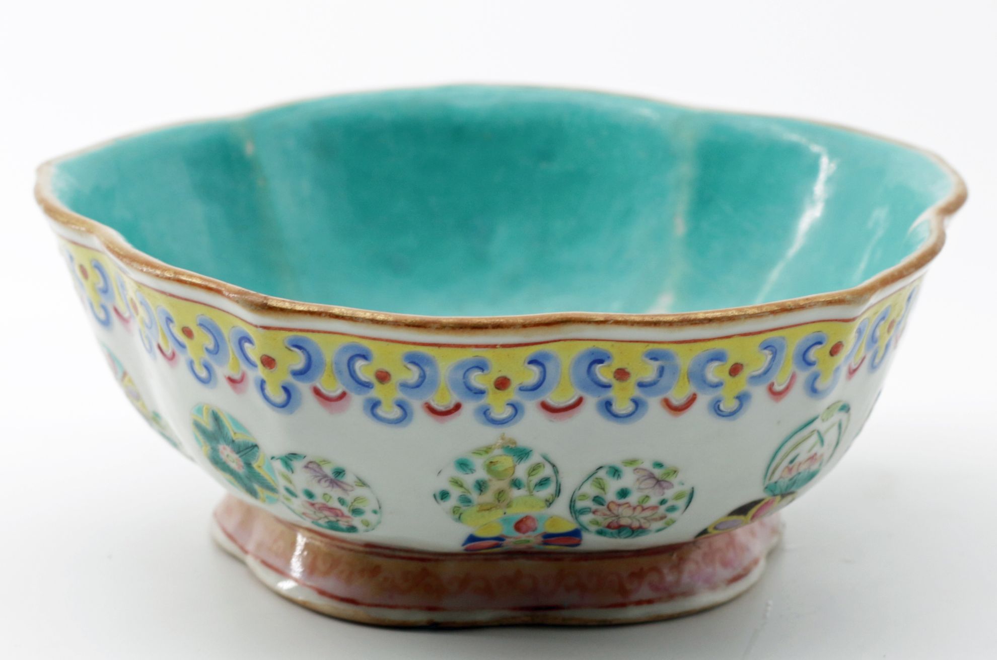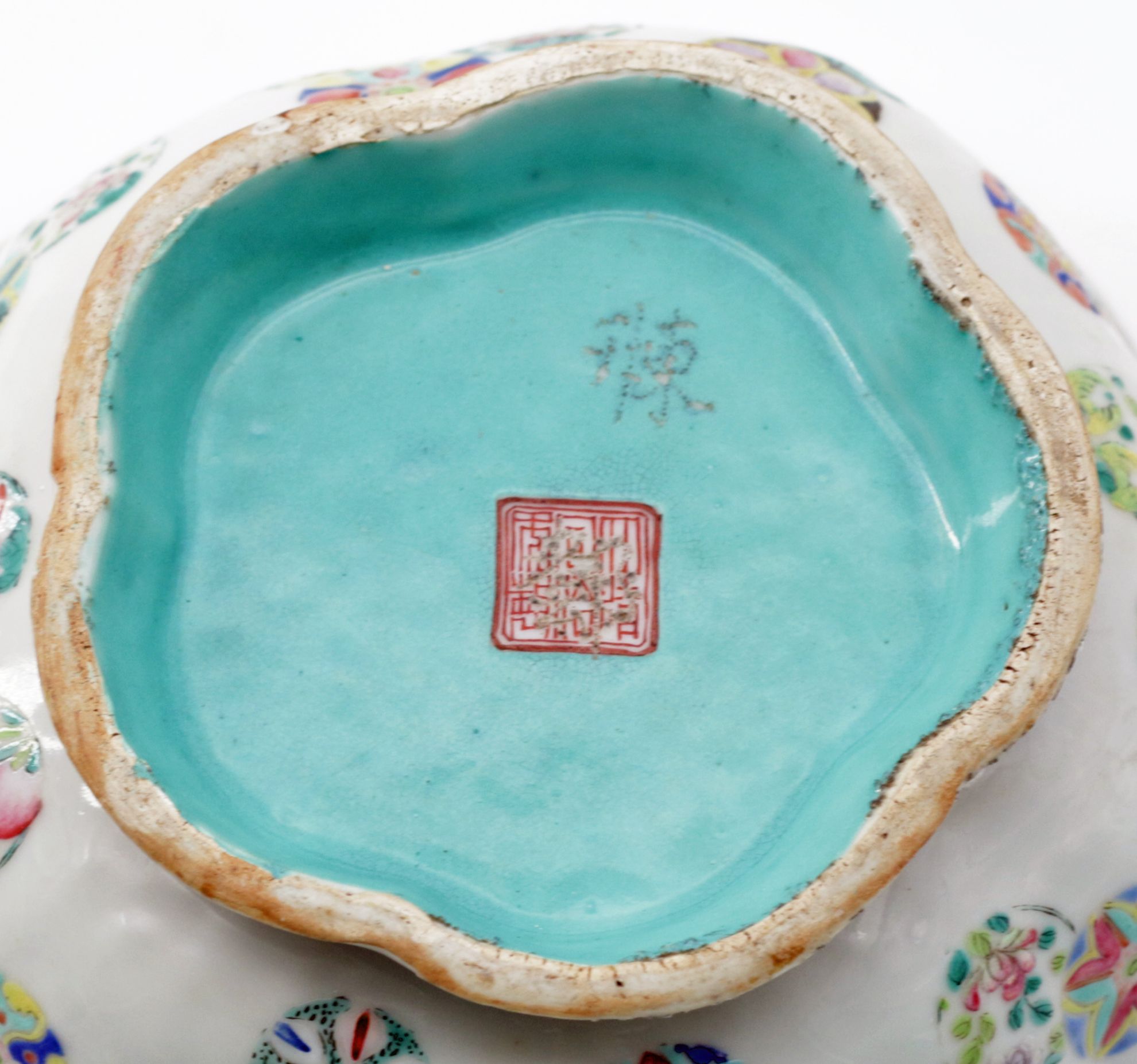 OverviewPorcelain bowl in famille rose enamels with a lobed lotus-form body. Exterior decorated with floral and foliate motifs in polychrome palette; interior finished in a distinctive turquoise glaze. Traditional Chinese decorative arts form drawing from Qing dynasty ceramic traditions.Dating / BackgroundLikely late Qing dynasty, with characteristics consistent with Guangxu period production. The turquoise interior glaze and iron-red seal mark reflect decorative conventions widely used in export and domestic wares of the period. Such lotus-form bowls were produced in Jingdezhen kilns and remained popular into the early Republic period, though examples with this glaze quality and foot treatment align more closely with late Qing manufacture.Why CollectFamille rose porcelain remains a foundational category within Chinese decorative arts. The lotus form carries symbolic meaning associated with purity and renewal, while the turquoise interior provides strong visual contrast and display appeal. Collectors value these pieces for both aesthetic presence and their connection to Qing ceramic traditions.DimensionsDiameter: 8 inchesHeight: 3.5 inchesConditionLight wear to foot rim consistent with age. Minor surface variations and glaze irregularities typical of hand-finished porcelain. No major structural damage observed.