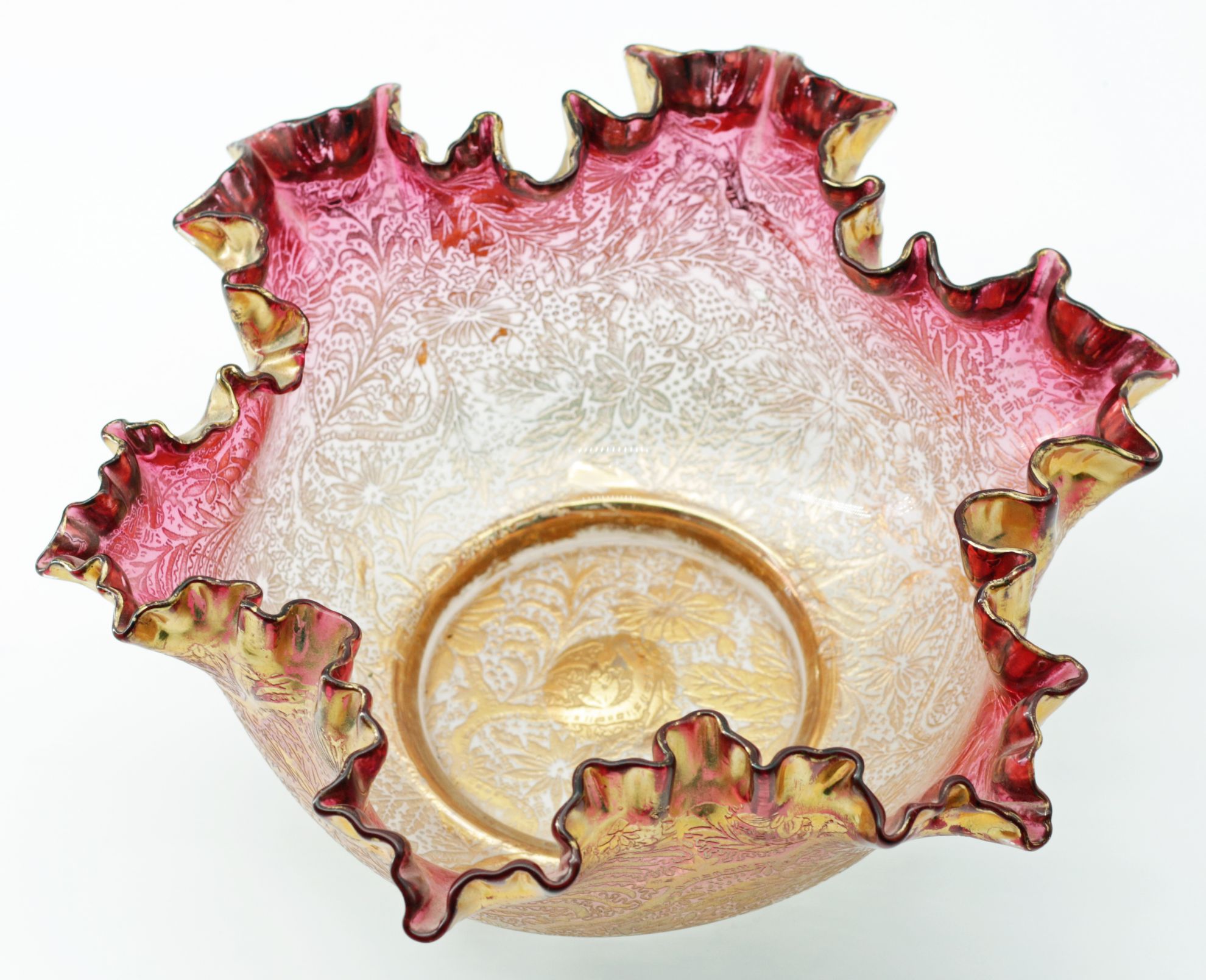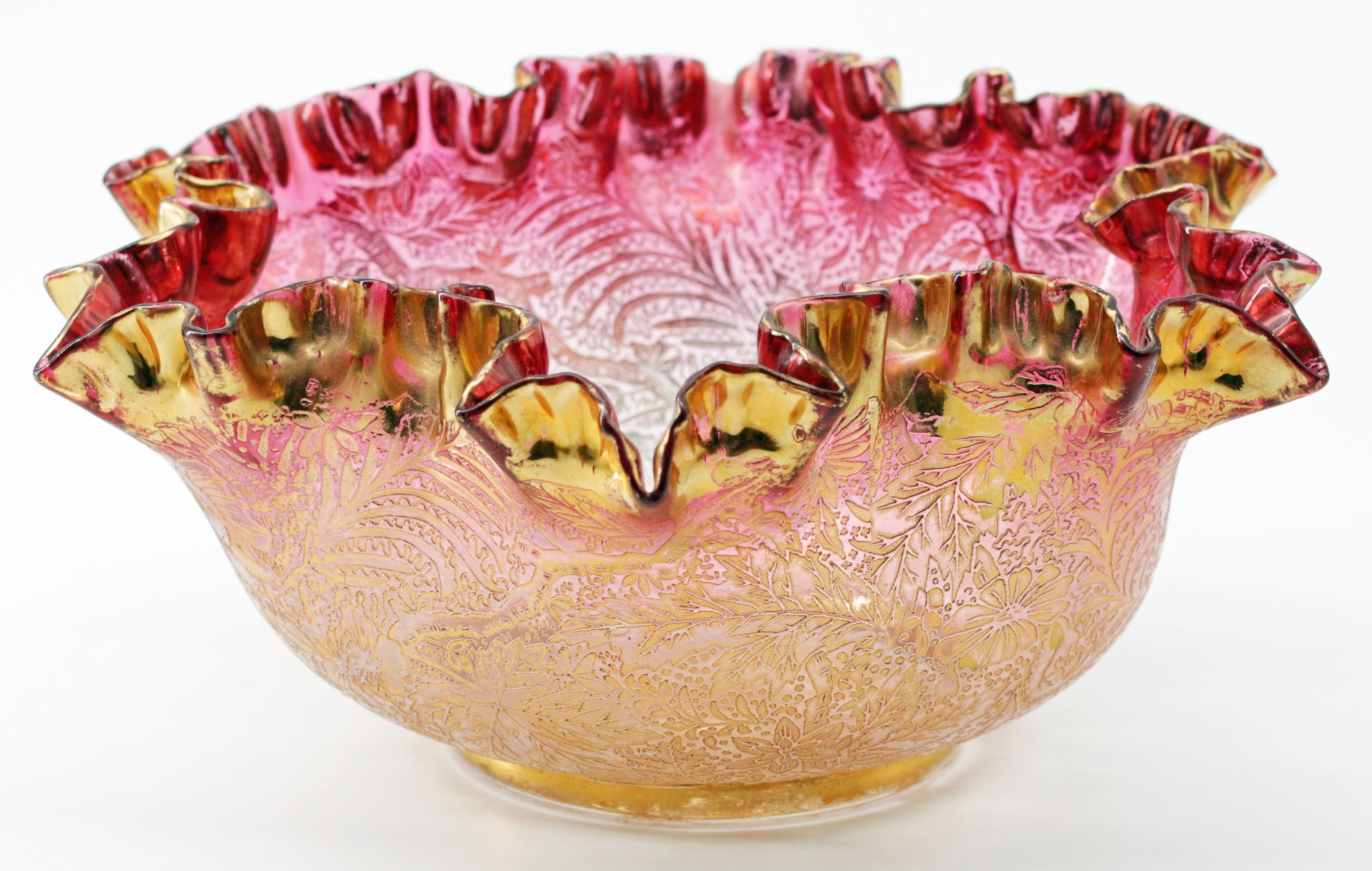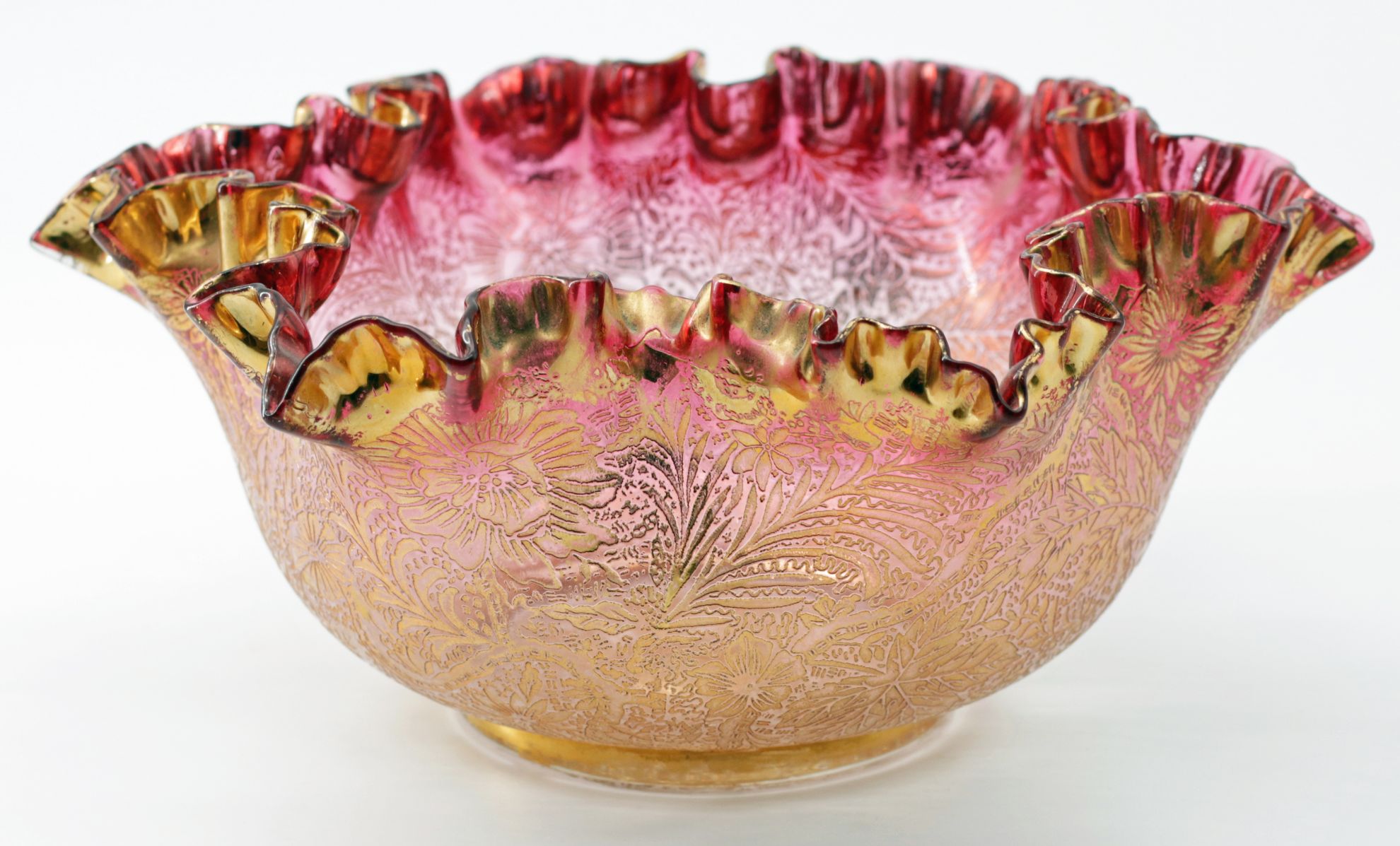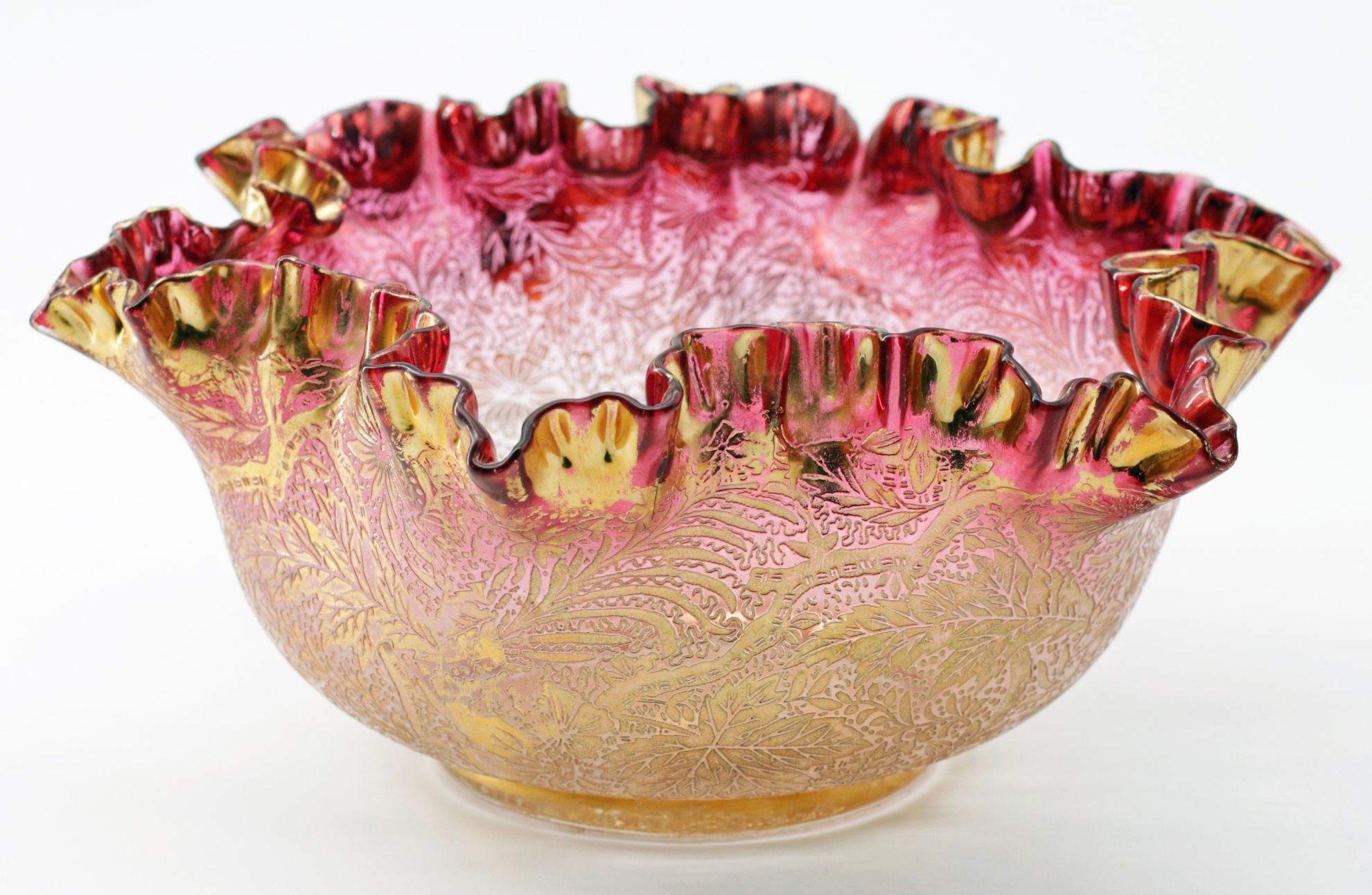 OverviewHandblown Bohemian art glass bowl in gold ruby (cranberry) with a deeply ruffled rim. The exterior is acid-etched with dense Orientalist floral and foliate ornament and finished with parcel gilding in matte and burnished tones. Late 19th to early 20th century Central European decorative arts (Belle Epoque / Edwardian-era taste).Dating / BackgroundThis bowl is attributed to Moser of Karlsbad (Karlovy Vary, Czech Republic). Moser began as a decorating and engraving studio in the 1850s and is closely associated with luxury Bohemian glass featuring rich color, acid-etching, and high-quality gilding. Comparable etched-and-gilt patterns are illustrated in period trade material; marks vary and many late-19th-century pieces are unmarked, so attribution is based on color, technique, and finishing quality. Related Bohemian makers can include Harrach and Fritz Heckert, but the overall treatment aligns strongly with Moser practice.Why CollectGold ruby glass requires precise control of metallic colorants and careful reheating to develop the color. Allover acid-etching combined with parcel gilding is a hallmark of high-end Bohemian production and delivers strong shelf presence. This is an excellent form for collectors of Moser and Belle Epoque decorative arts, and it displays well as a centerpiece or cabinet object.DimensionsDiameter: 10.5 inHeight: 4 inConditionLight rubbing to high-point gilding and minor age wear at the rim. No chips or cracks observed.