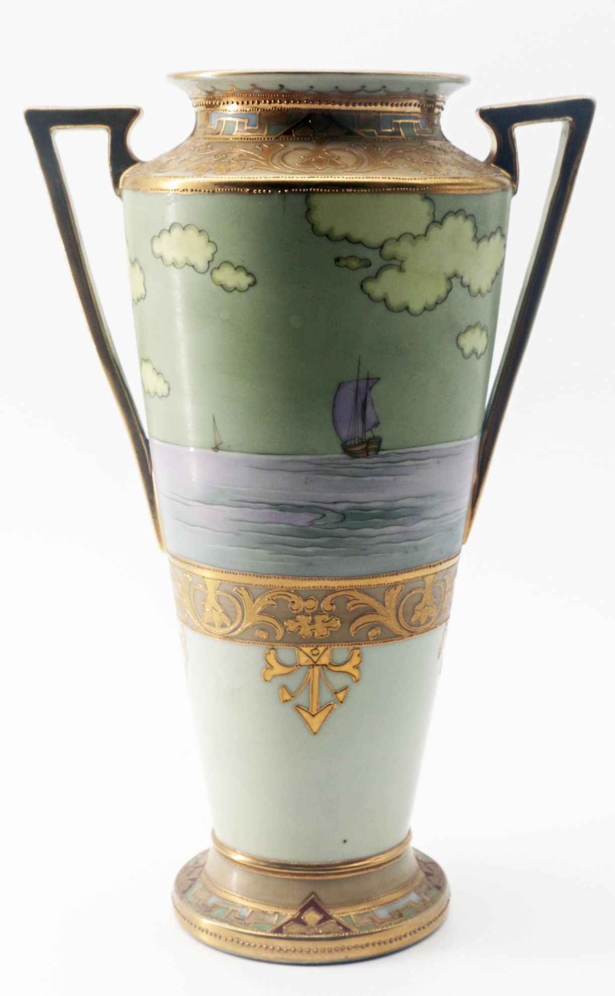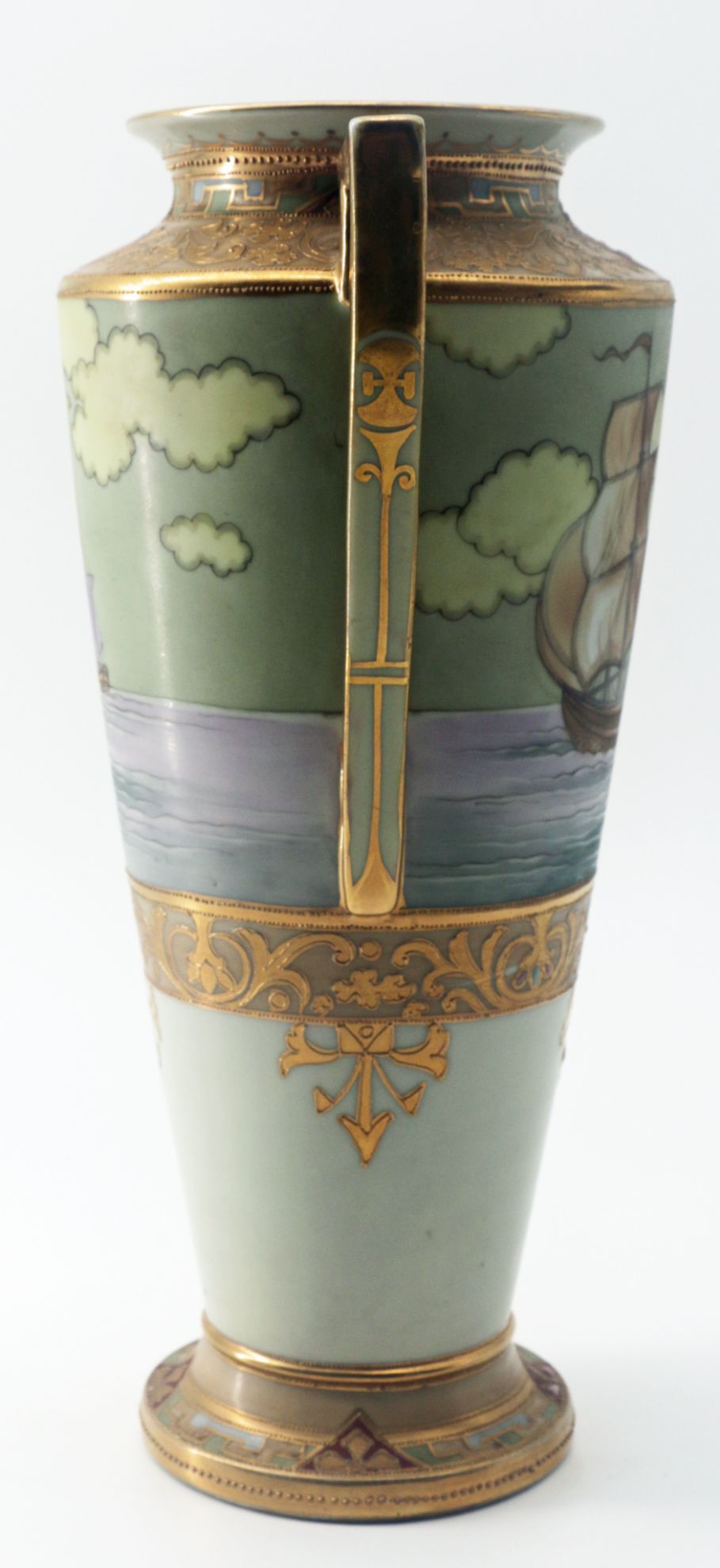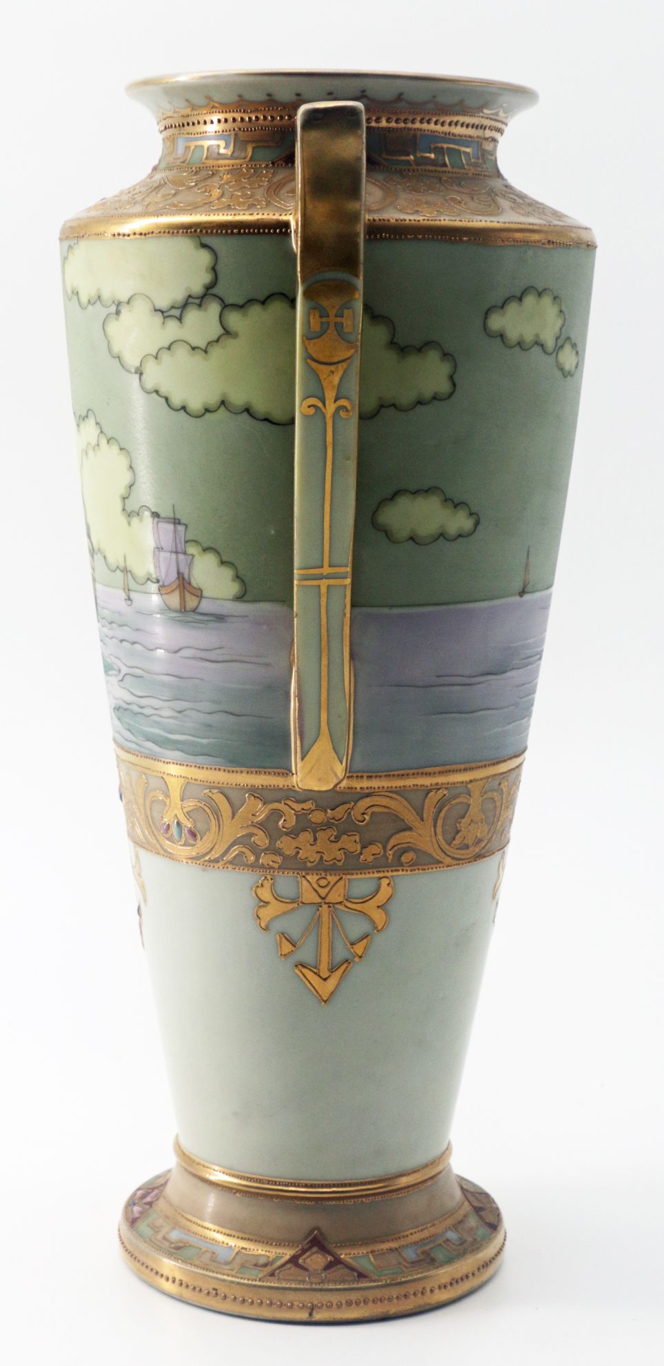 OverviewPorcelain vase with hand-painted scenic landscape panel, likely enamel decoration over a white ground, framed by extensive gilt ornament. The composition reflects late Meiji to early Taisho export aesthetics, blending naturalistic landscape painting with structured decorative symmetry approaching early Art Deco sensibility.Dating / BackgroundThis example falls within the Nippon export period, generally dated circa 1890 to 1921, prior to U.S. import regulations requiring “Japan” marking. Nippon wares were produced specifically for Western markets and often feature elevated decorative programs, including landscape reserves, heavy gilding, and refined porcelain bodies. Scenic examples such as this were among the more desirable output, appealing to collectors seeking painterly decoration rather than purely ornamental patterning.Why CollectNippon porcelain remains a well-established collecting category, with sustained demand for pieces combining strong hand-painted decoration and gilded embellishment. Scenic landscape examples stand apart from standard floral wares, offering greater visual narrative and display presence. This piece is particularly effective as a cabinet object or shelf accent, with its combination of painterly reserve and reflective gilt surface enhancing light and depth in display.DimensionsHeight: 12 inchesWidth: 5 inchesDepth: 5 inchesConditionGood overall condition consistent with age. Minor wear to gilt decoration, typical for Nippon wares of this period. No significant structural damage observed. Surface presents well with strong decorative integrity.