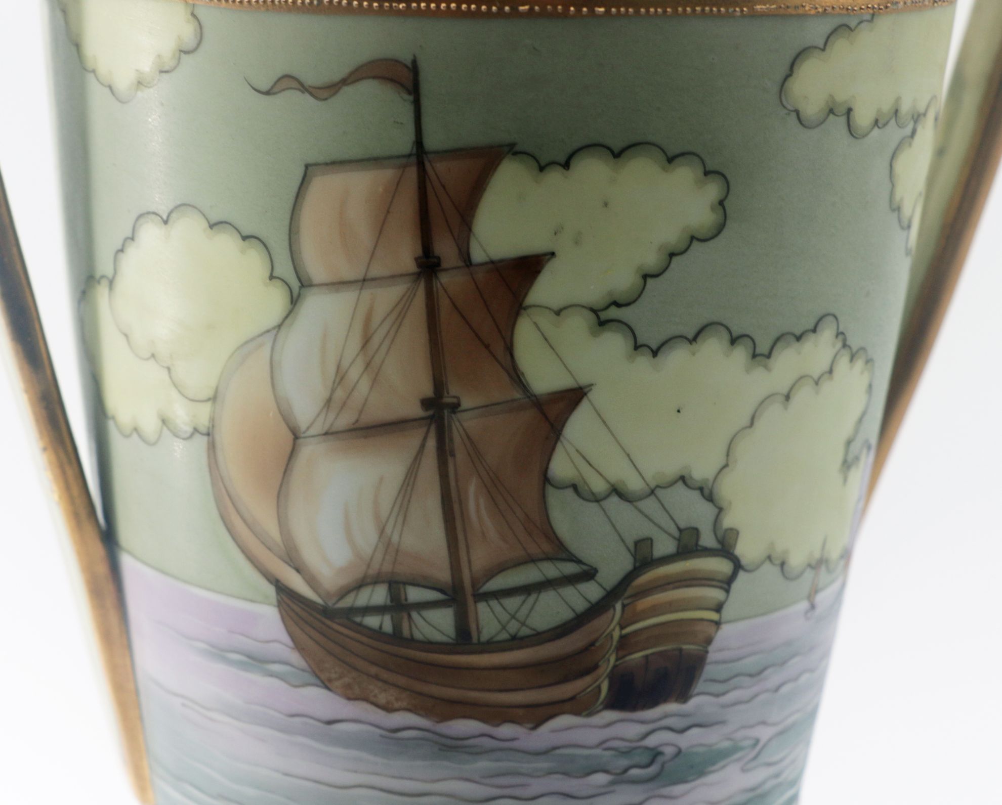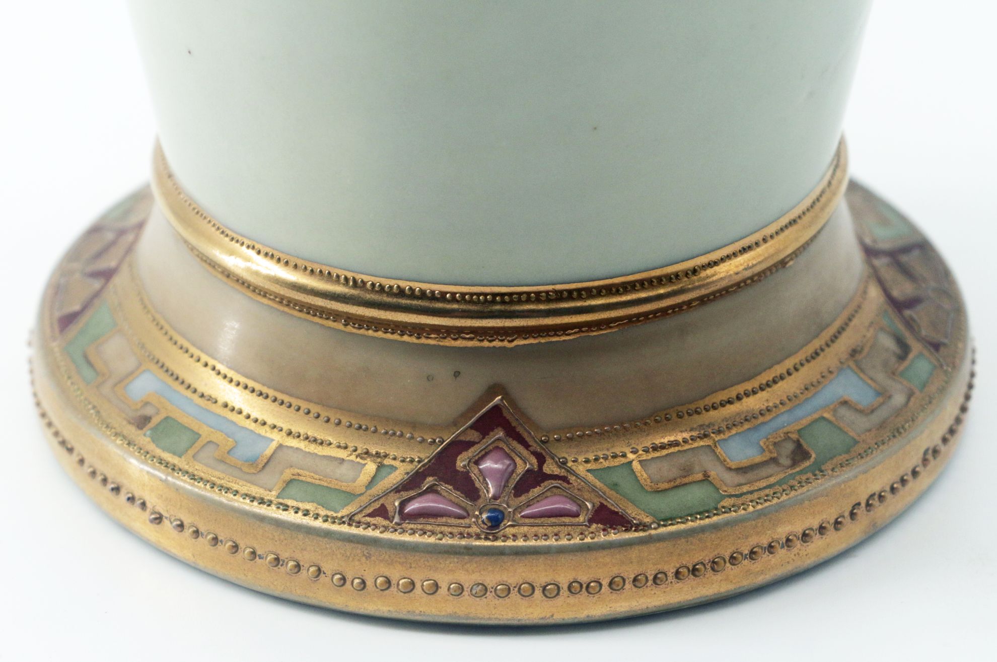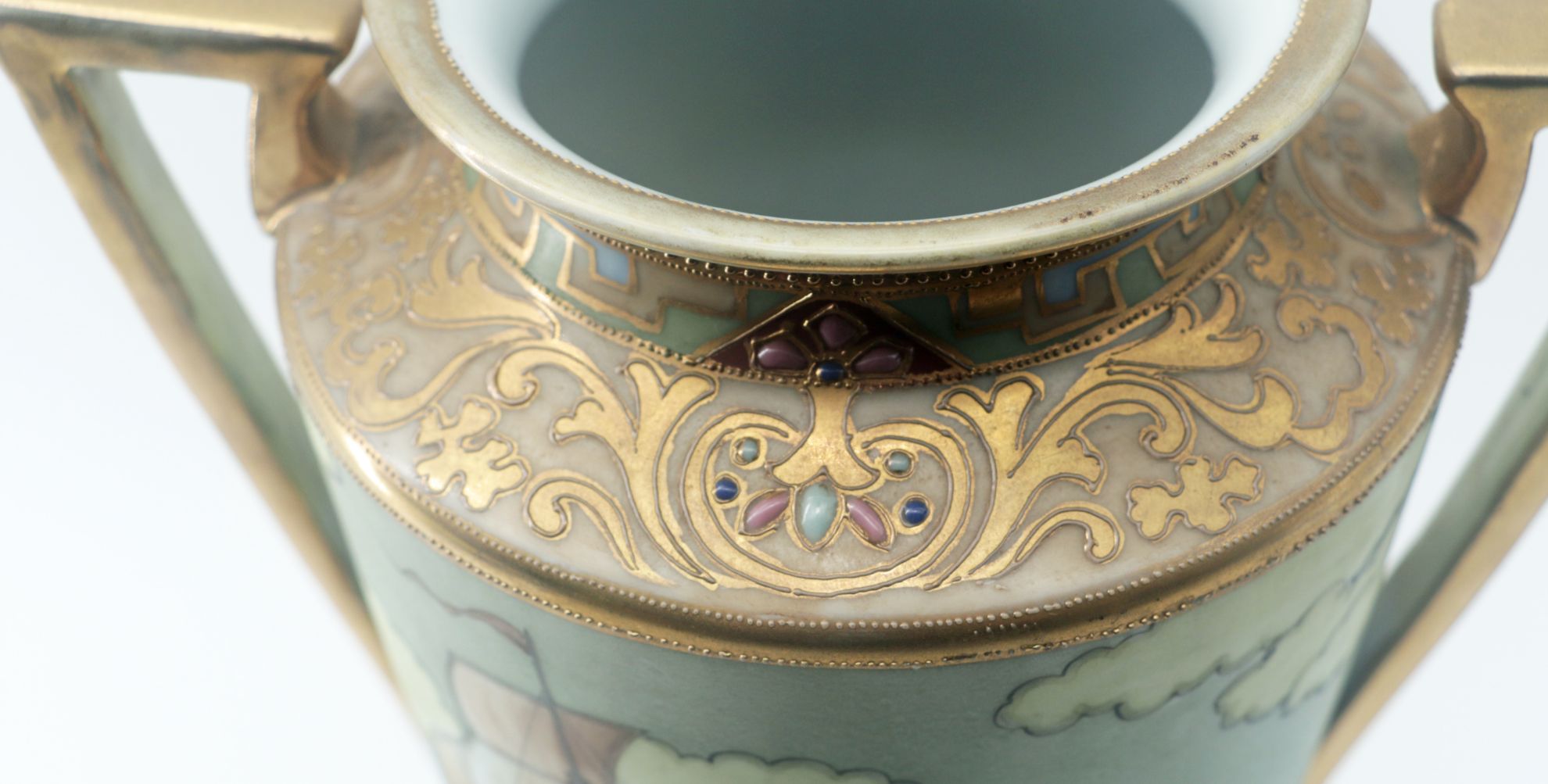 OverviewPorcelain vase with hand-painted scenic landscape panel, likely enamel decoration over a white ground, framed by extensive gilt ornament. The composition reflects late Meiji to early Taisho export aesthetics, blending naturalistic landscape painting with structured decorative symmetry approaching early Art Deco sensibility.Dating / BackgroundThis example falls within the Nippon export period, generally dated circa 1890 to 1921, prior to U.S. import regulations requiring “Japan” marking. Nippon wares were produced specifically for Western markets and often feature elevated decorative programs, including landscape reserves, heavy gilding, and refined porcelain bodies. Scenic examples such as this were among the more desirable output, appealing to collectors seeking painterly decoration rather than purely ornamental patterning.Why CollectNippon porcelain remains a well-established collecting category, with sustained demand for pieces combining strong hand-painted decoration and gilded embellishment. Scenic landscape examples stand apart from standard floral wares, offering greater visual narrative and display presence. This piece is particularly effective as a cabinet object or shelf accent, with its combination of painterly reserve and reflective gilt surface enhancing light and depth in display.DimensionsHeight: 12 inchesWidth: 5 inchesDepth: 5 inchesConditionGood overall condition consistent with age. Minor wear to gilt decoration, typical for Nippon wares of this period. No significant structural damage observed. Surface presents well with strong decorative integrity.
