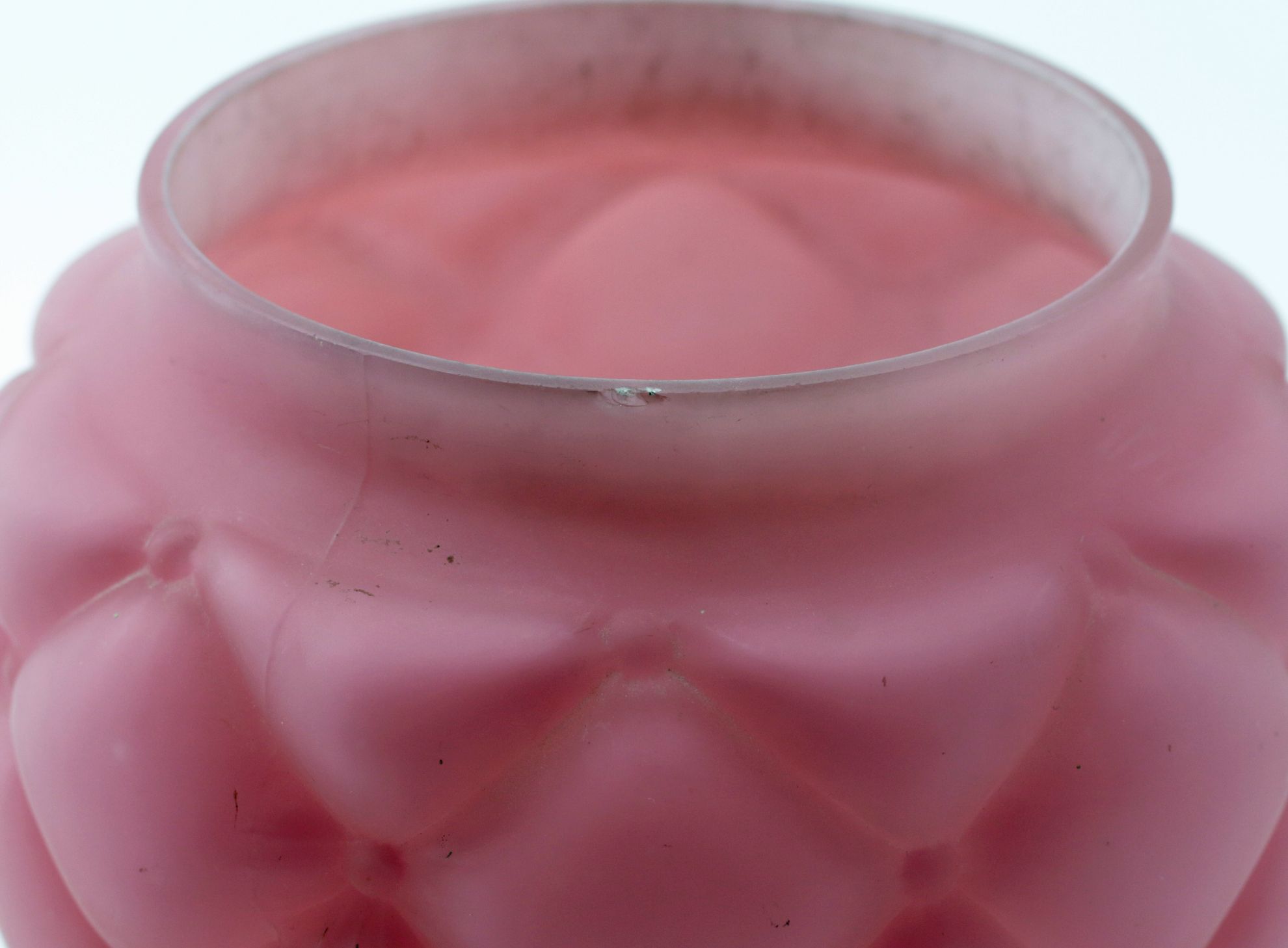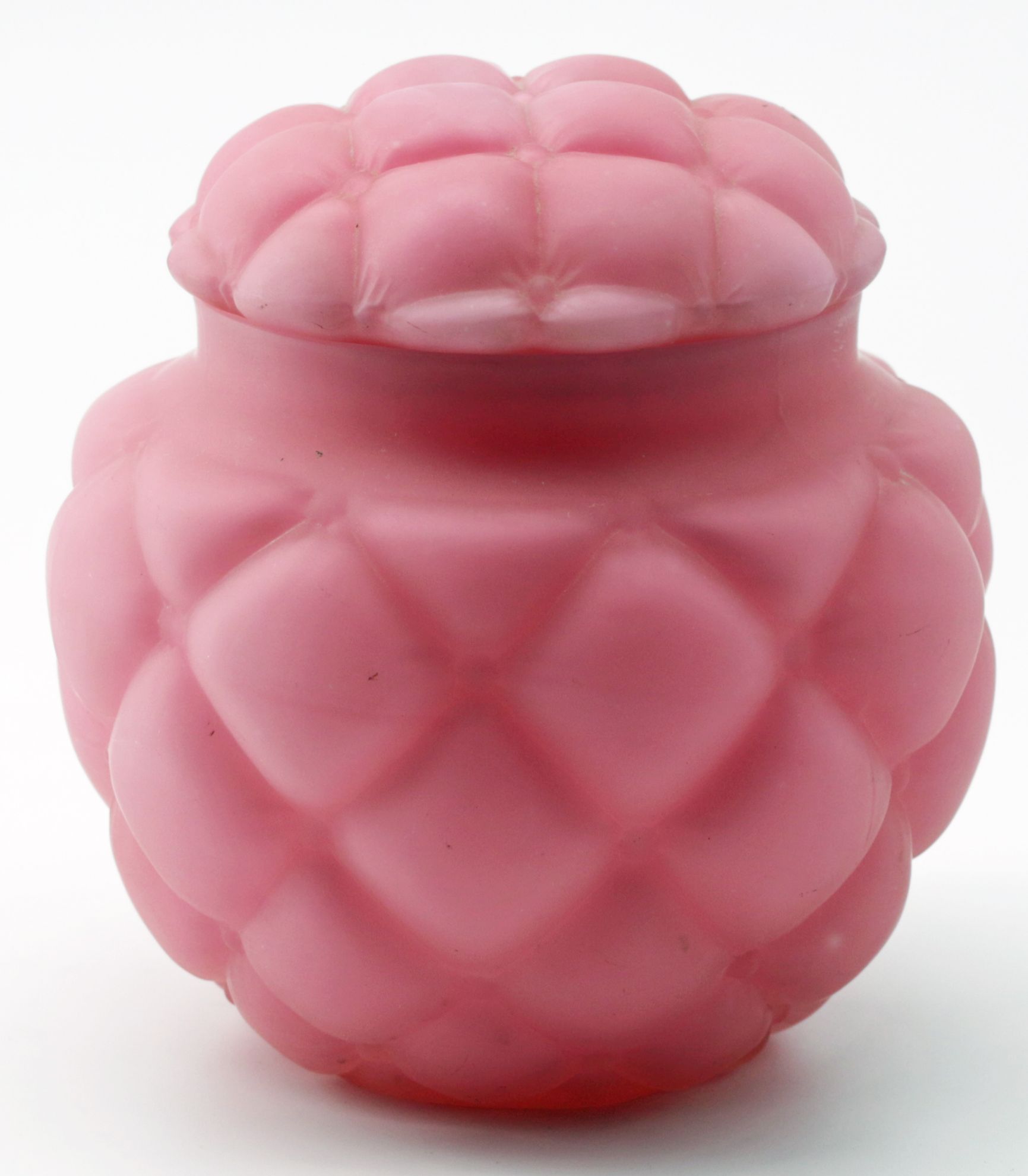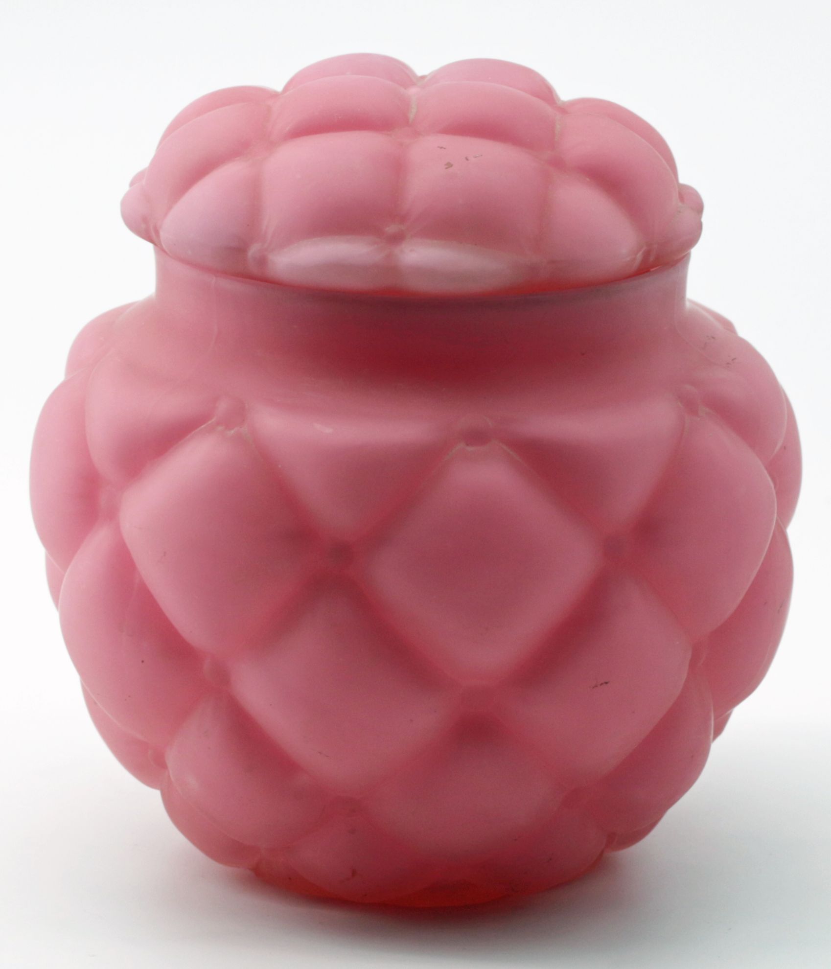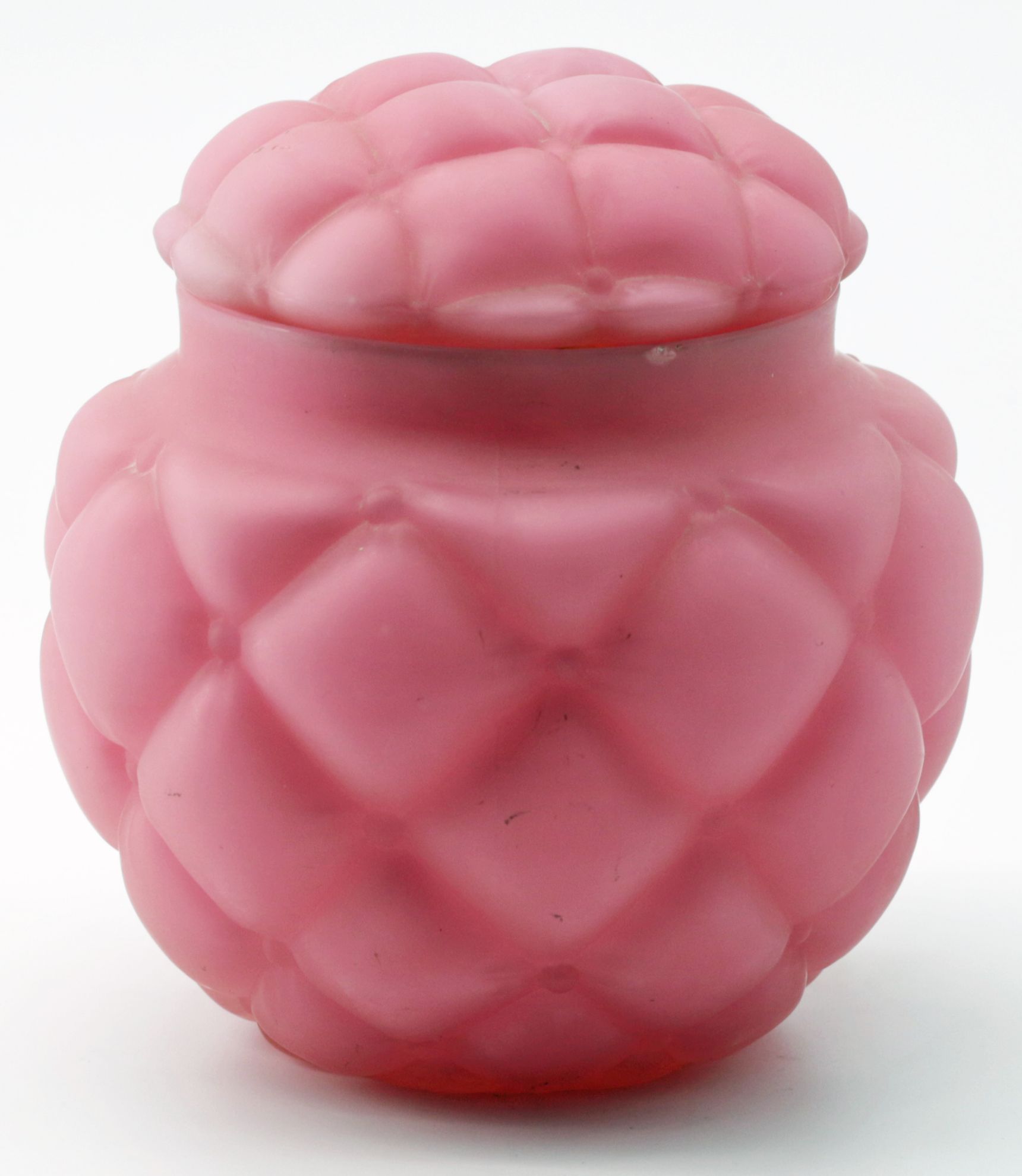 OverviewAmerican decorative art glass covered jar in pink satin finish with quilted pattern. The form is attributed to Consolidated Lamp & Glass and reflects early 20th century pressed glass production with a refined matte surface treatment. The domed lid and rounded body create a cohesive and visually appealing silhouette consistent with period dresser or vanity wares.Dating / BackgroundConsolidated Lamp & Glass Company, active in the late 19th and early 20th centuries, produced a wide range of pressed and art glass, including satin and colored wares. Quilted and paneled patterns were popular decorative motifs, combining geometric texture with soft coloration. This example aligns with known production styles from the early 1900s.Why CollectAppealing combination of color, texture, and form. Representative of early American art glass production. Versatile decorative object suitable for vanity, dresser, or cabinet display. Increasing collector interest in Consolidated and related American glass firms.DimensionsHeight: 6 inchesDiameter: 4.5 inchesConditionGood overall condition with expected light wear consistent with age and use. No significant cracks or repairs observed. Minor surface wear and typical manufacturing irregularities may be present.