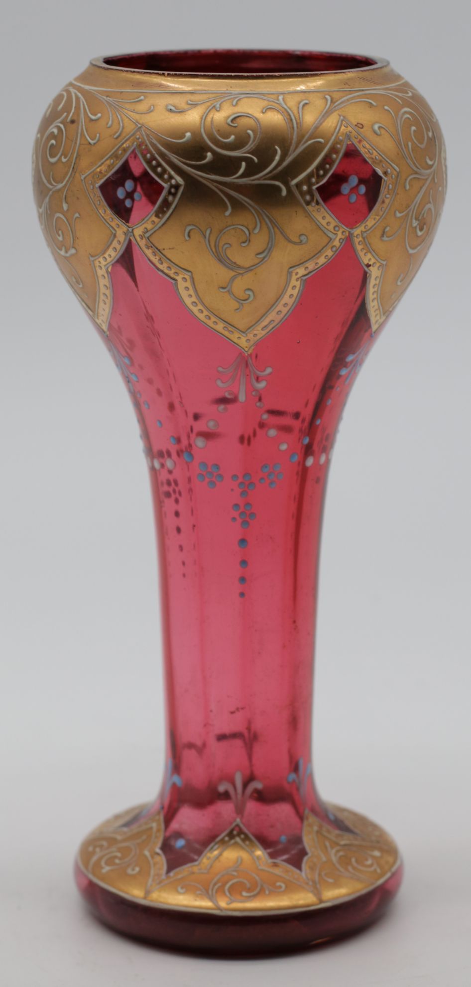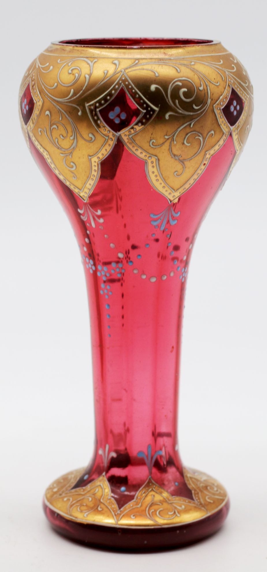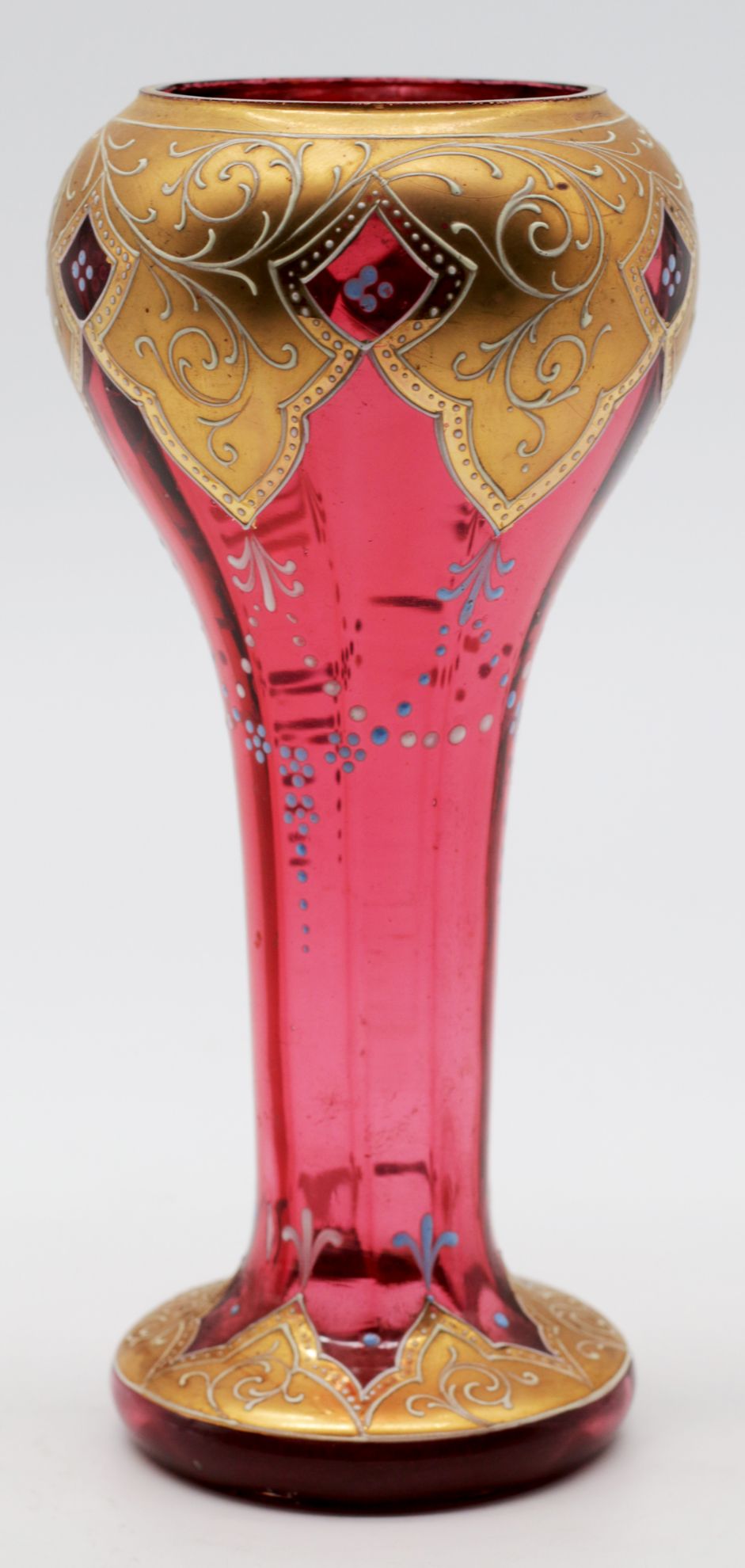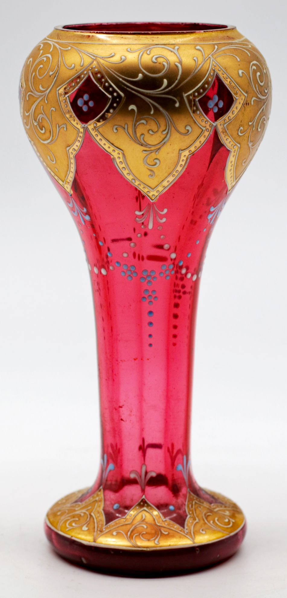 Bohemian cranberry glass vase with finely executed gilt decoration and applied jeweled accents. The vivid color clarity and strong preservation elevate this example within late 19th century decorative glass production.