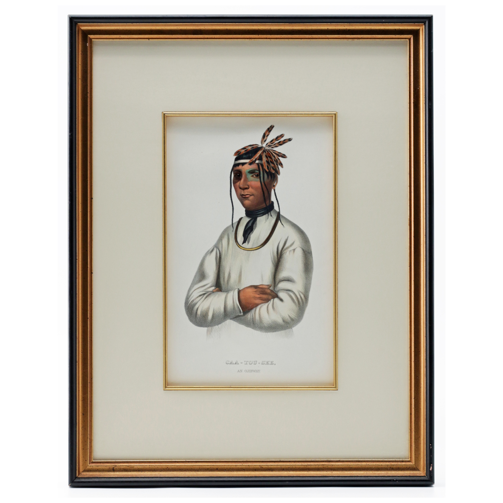 Beautifully framed in black with gold lining this hand colored lithograph depicts Obijway chief Caa-Tou-See.