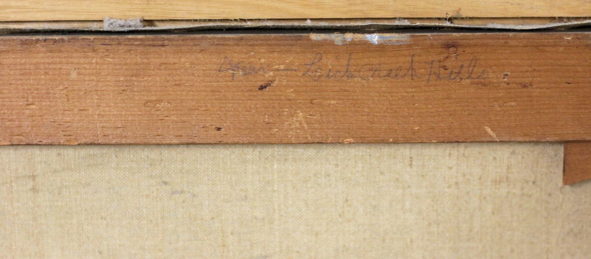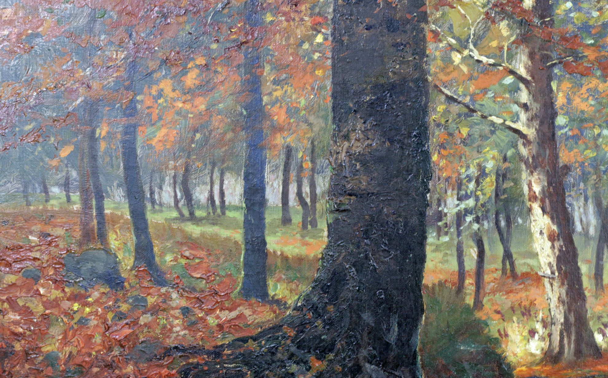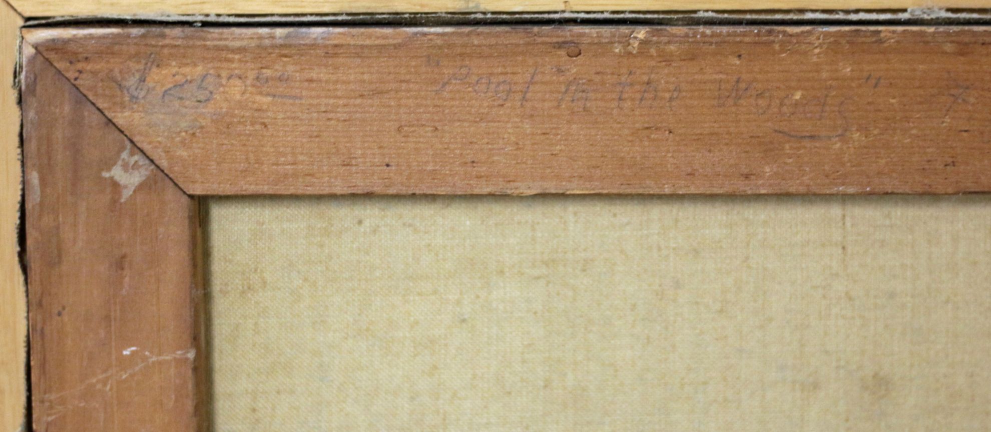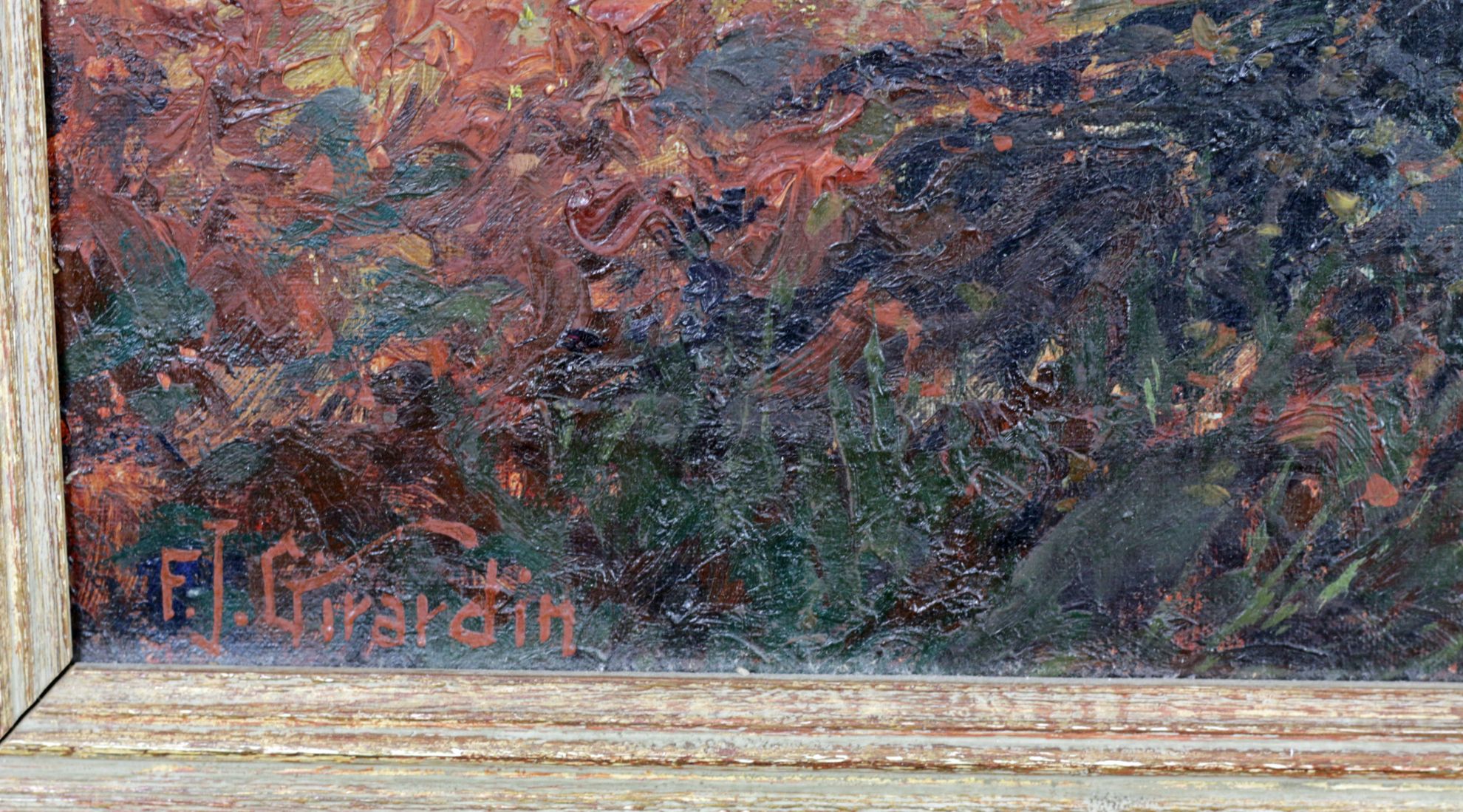 OverviewOil on canvas landscape titled Pool In The Woods, signed lower left F. J. Girardin and titled verso on the upper rear stretcher. The composition depicts a wooded Indiana landscape with autumnal foliage and reflective water, with confident brushwork and painterly surface texture. Medium: oil on canvas. Style: American Impressionism / Midwest regional Impressionism. Framed.Dating / BackgroundFrank J. Girardin (1856-1945) was an American landscape painter associated with the Richmond Group of Indiana and the broader Midwest Impressionist movement. Trained at the Cincinnati Art Academy, he worked in Indiana before relocating to California later in life. This work is titled verso and executed on a Devoe and Reynolds artist canvas, consistent with his Indiana period, circa 1905-1925.Why CollectGirardin landscapes represent an important chapter in American regional Impressionism. This painting combines strong compositional structure with seasonal color and atmospheric depth, offering both decorative appeal and art historical context. Signed examples with titled verso inscriptions are particularly desirable to collectors of Indiana and Midwest American art.Dimensions (inches)Height: 24 1/8Width: 34 5/8Depth: 2 3/8ConditionVery good overall condition. Surface shows minor age-appropriate craquelure and light scattered inpainting consistent with early 20th century oil on canvas. Canvas appears stable with no visible tears. Frame shows light wear.ReferenceSigned lower left and titled verso on the upper stretcher. Richmond Group context: Girardin is frequently cited among the Indiana painters associated with the Richmond art community and Midwest Impressionism.