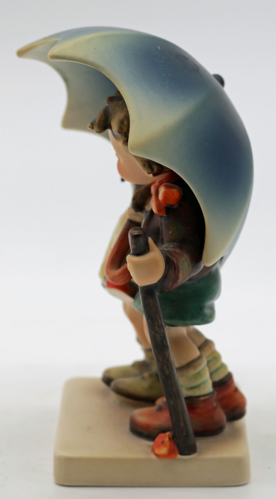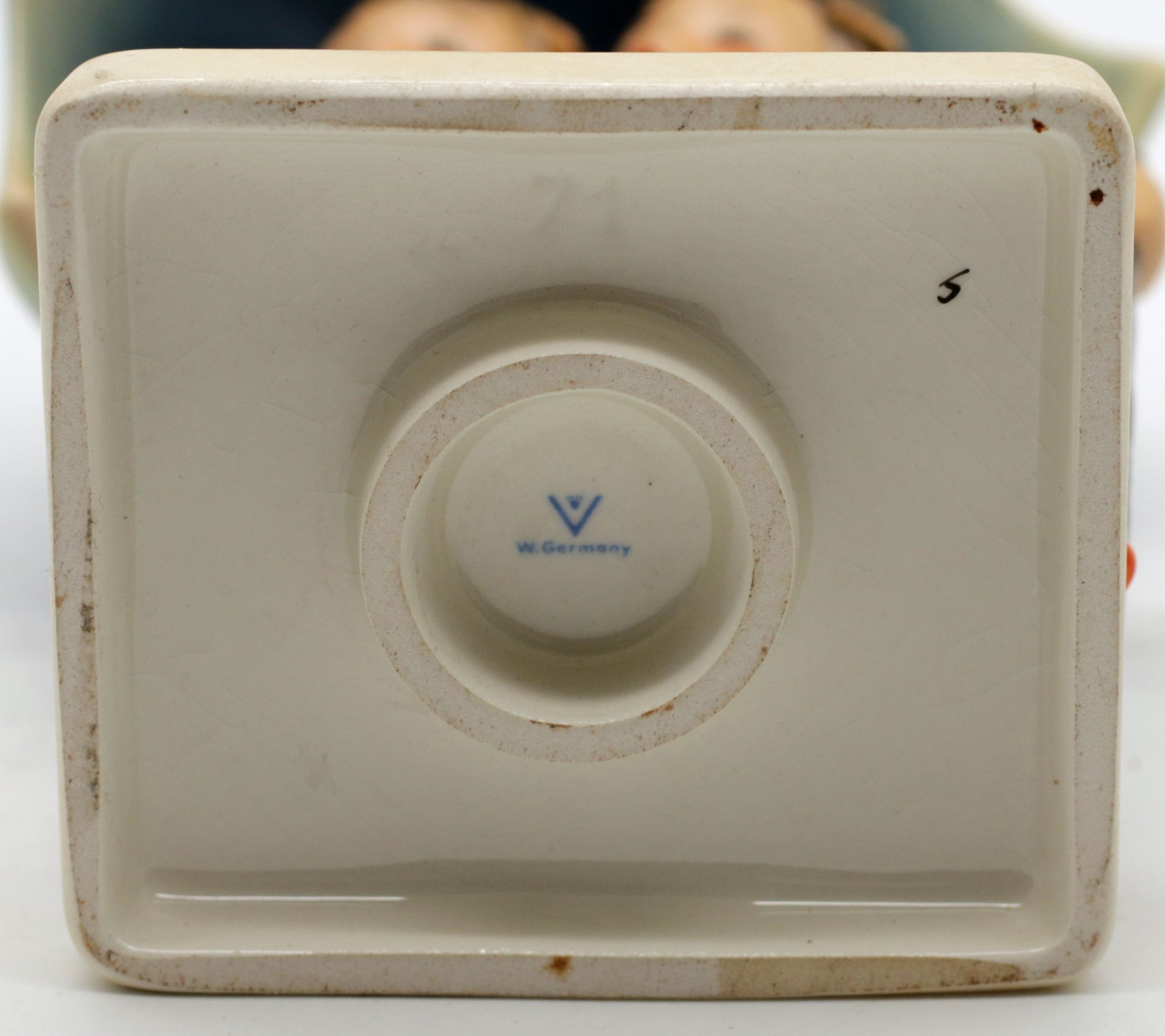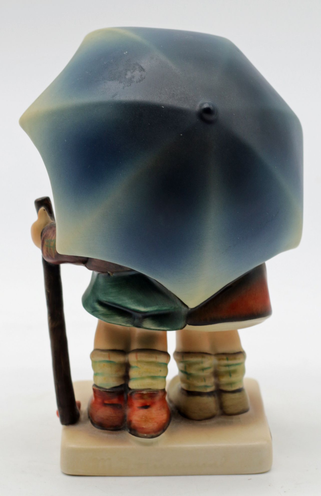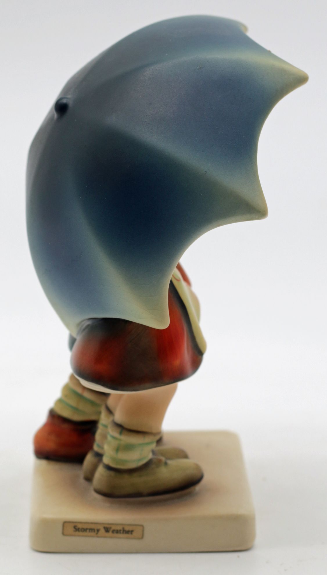 OverviewHand-painted porcelain figurine depicting two children sheltering beneath a large umbrella. The composition is titled Stormy Weather and is cataloged as model HUM 71 within the Goebel Hummel line. The figure demonstrates the soft modeling, expressive faces, and muted Bavarian palette associated with classic Hummel production. Style: Mid-20th Century German figurative porcelain.Dating / BackgroundThe underside bears the stylized bee over V mark with the inscription W. Germany, identifying the piece as TMK-5 production. The TMK-5 trademark was used during the later West Germany manufacturing era and corresponds to the mature period of Goebel Hummel export production. Model HUM 71, Stormy Weather, remains one of the most recognized compositions derived from the illustrations of Sister Maria Innocentia Hummel.Why CollectStormy Weather HUM 71 is among the most iconic Hummel figurines and appears in nearly every serious Hummel reference. The design captures the sentimental narrative style that made the Hummel line internationally famous. Collectors frequently seek examples with clearly preserved painting and well-defined TMK marks because they represent the mature export era of Goebel porcelain.Dimensions (inches)Height: 6.125Width: 4.5Depth: 3.25ConditionVery good condition with strong color and clean surfaces. Light age-appropriate wear visible on the base consistent with display. No chips, cracks, or repairs observed.