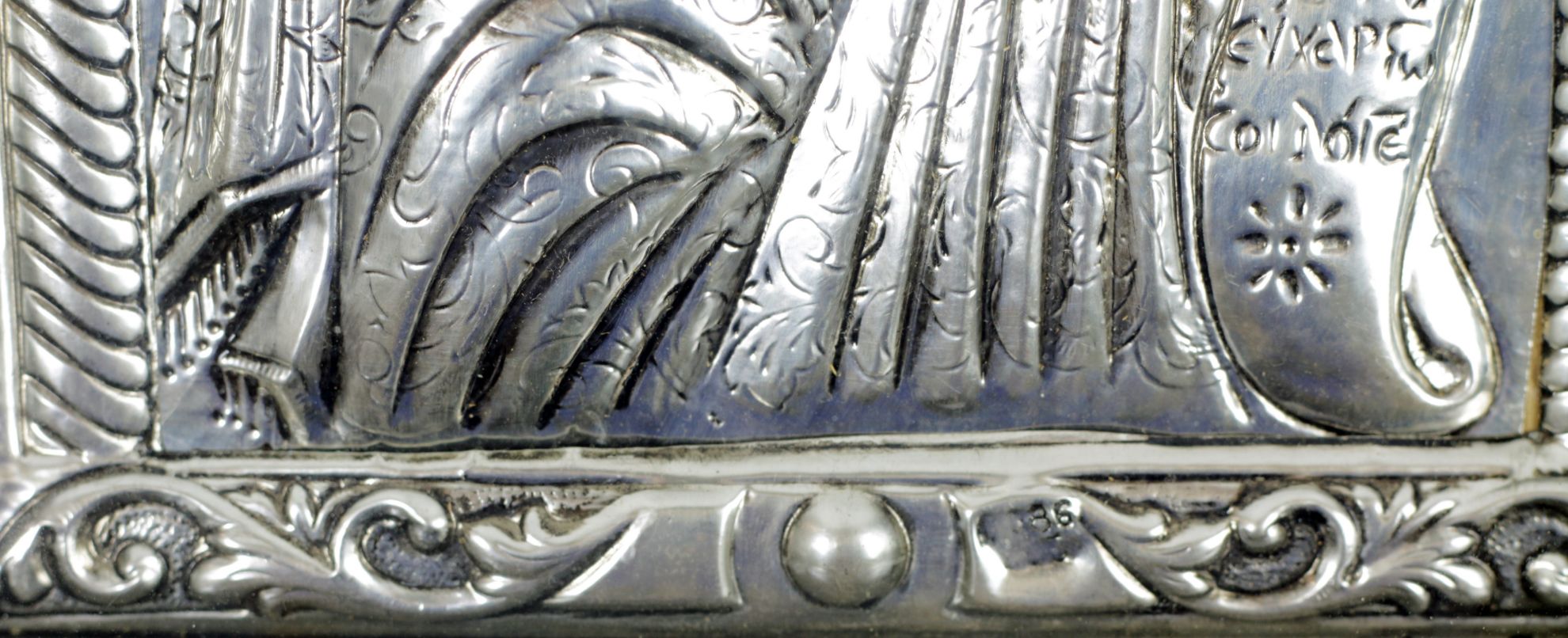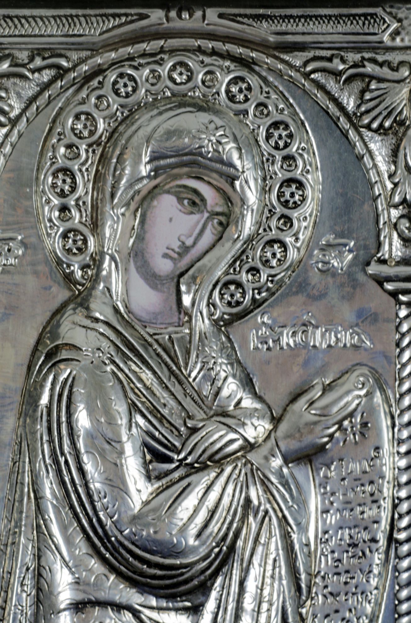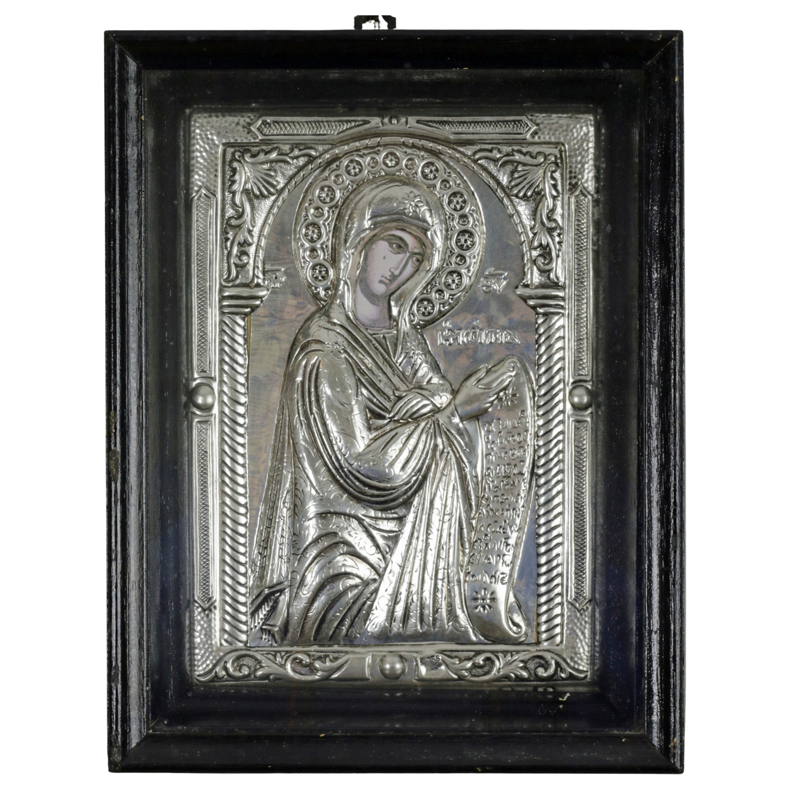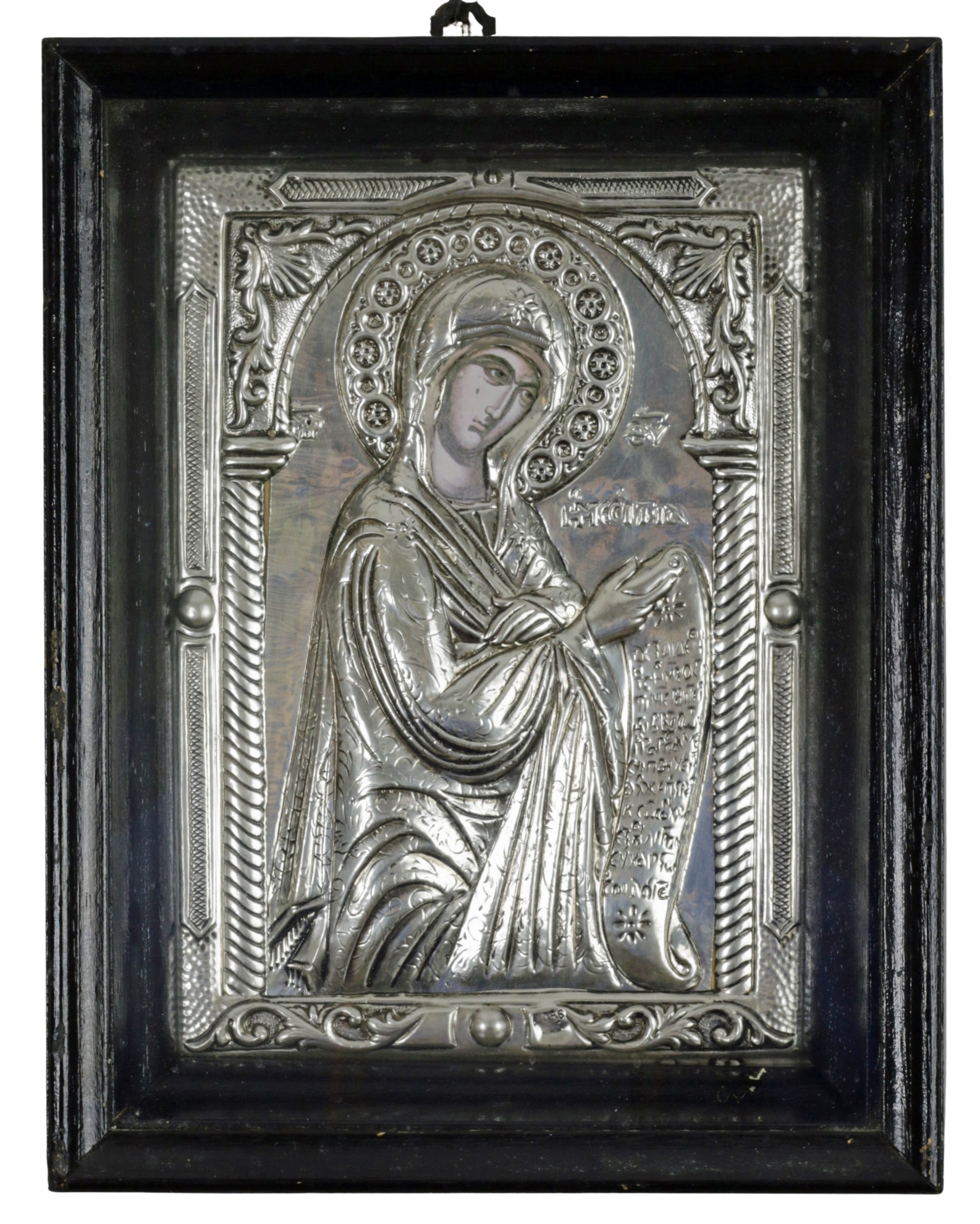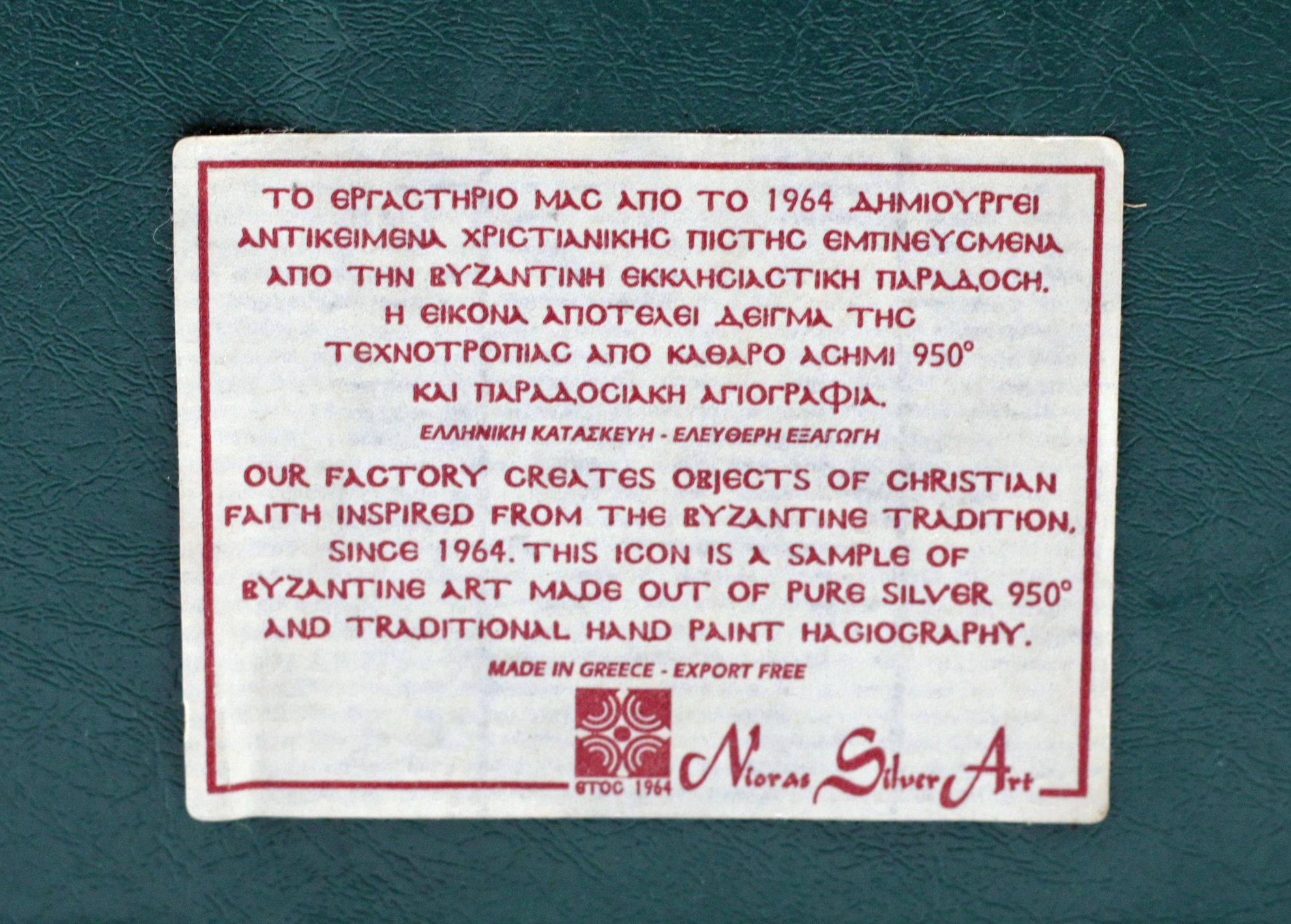 OverviewGreek Orthodox icon depicting the Theotokos in the Hagiosoritissa type, shown without the Christ Child and holding a scroll, symbolizing her role as intercessor. The image is executed with a repoussé and chased 950 silver riza over a painted substrate, with the face rendered in traditional hand-painted technique. Style: Byzantine revival, based on Middle Byzantine devotional models.Dating / BackgroundProduced by Nioras Silver Art, Greece, a workshop active since 1964 specializing in Byzantine-inspired ecclesiastical objects. The Hagiosoritissa type originates in Constantinople and is associated with the Blachernae shrine, where the Virgin was venerated as an intercessor for the faithful. The accompanying label confirms 950 purity silver and traditional hand-painted hagiography. This example represents a modern continuation of that long-standing iconographic tradition.Why CollectThe Hagiosoritissa is a historically significant and less commonly encountered Marian type compared to Hodegetria or Eleousa, making it of particular interest to collectors of Orthodox iconography. The combination of high-purity silver, repoussé craftsmanship, and traditional painted detail enhances both its artistic and material appeal. It serves equally as a devotional object and as a representative example of enduring Byzantine visual culture.Dimensions (inches)Height: 10.25 | Width: 8 | Depth: 1.5ConditionVery good overall. Light surface wear consistent with handling. Minor abrasions to silver under close inspection. Frame with light edge wear. No significant dents or losses observed. Painted areas intact.ReferenceHagiosoritissa type icons associated with the Blachernae tradition, Constantinople; Byzantine use of silver revetments (riza/oklad) in devotional imagery.