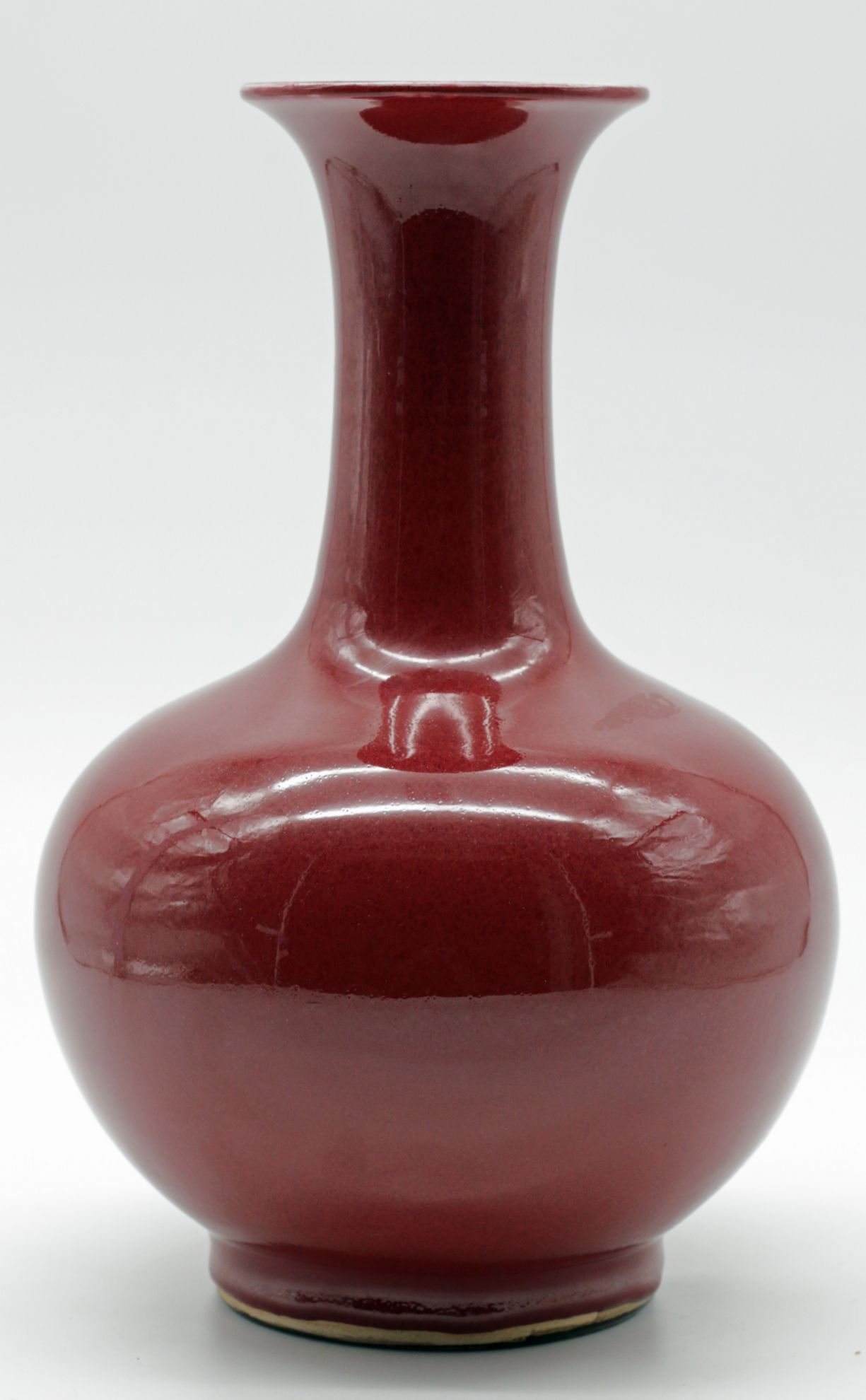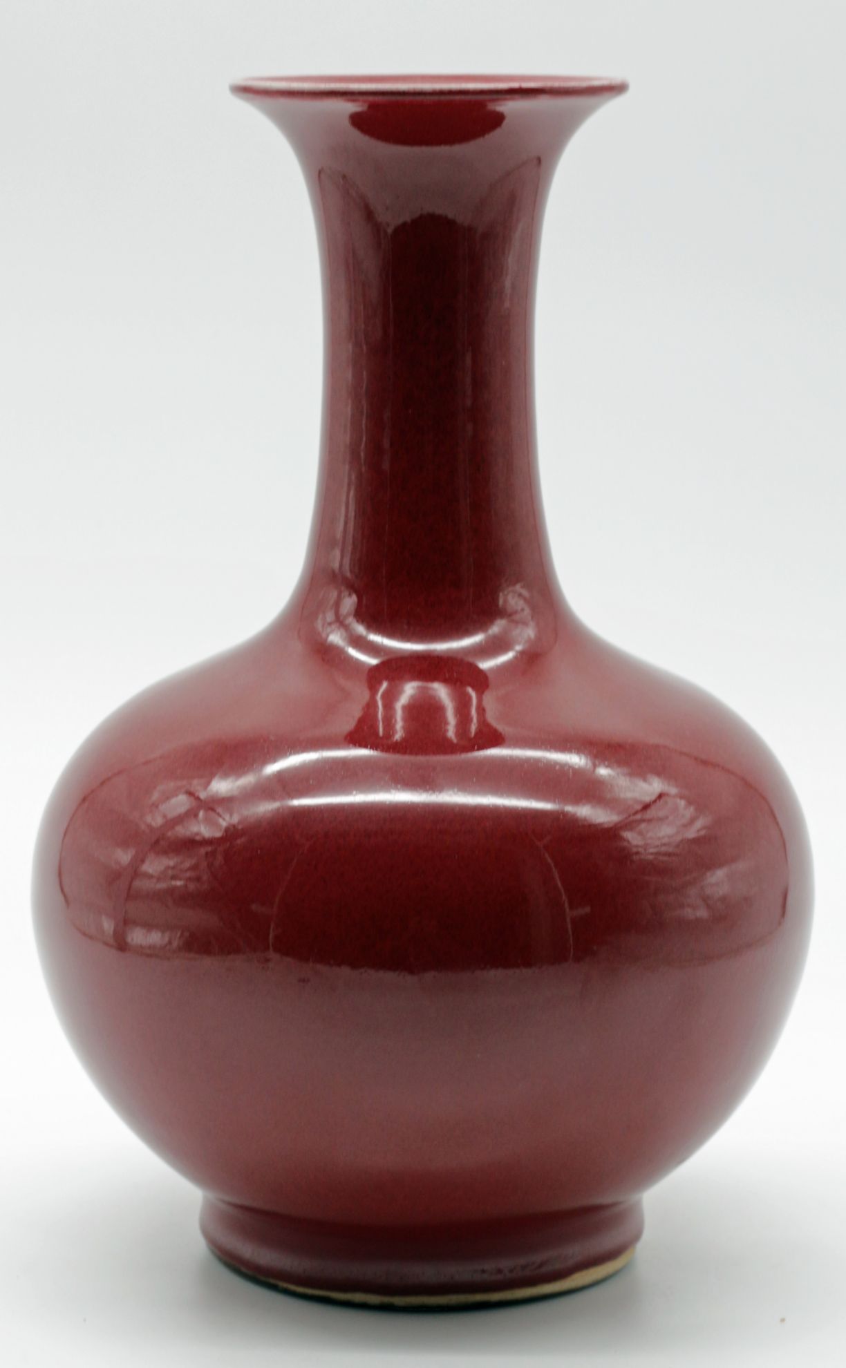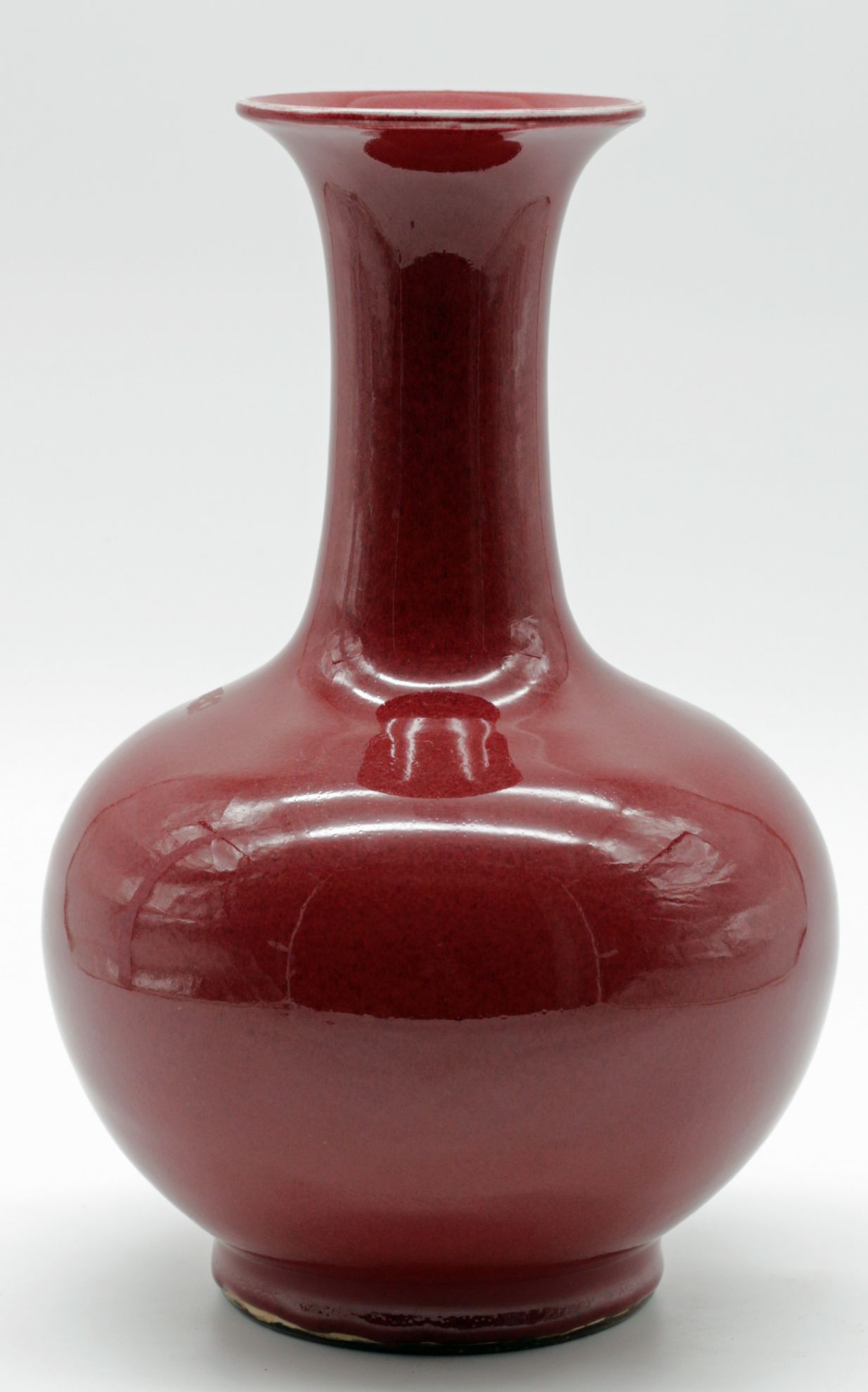 OverviewChinese porcelain bottle vase featuring a sang de boeuf (oxblood) copper red glaze over a high fired body. Classic monochrome decorative arts form with broad rounded shoulder, cylindrical neck, and gently flared rim. The glaze stops above the foot, revealing the unglazed foot ring.Dating / BackgroundSang de boeuf, or oxblood glaze, originates in earlier Chinese dynasties and was revived in later workshop production. This example reflects Qing-inspired monochrome traditions and is most consistent with mid-20th century Chinese production, circa 1950-1980. No reign mark present.Why CollectCopper red glazes are technically complex and highly prized for their depth of tone and firing variation. This example offers strong decorative presence, substantial weight, and classic bottle proportions suitable for collectors of Chinese ceramics or refined interior display.DimensionsHeight: 12 1/4 inchesWidth: 8 inchesDepth: 8 inchesWeight: 5.4 lbsConditionVery good overall. Minor surface wear consistent with handling. Light glaze variation at the foot rim. No visible cracks or restorations observed.