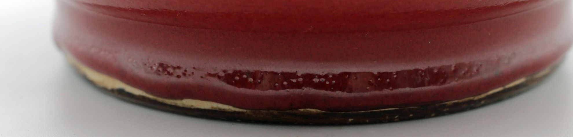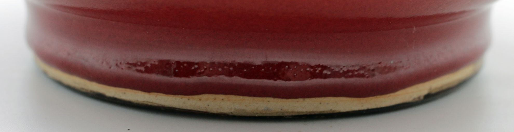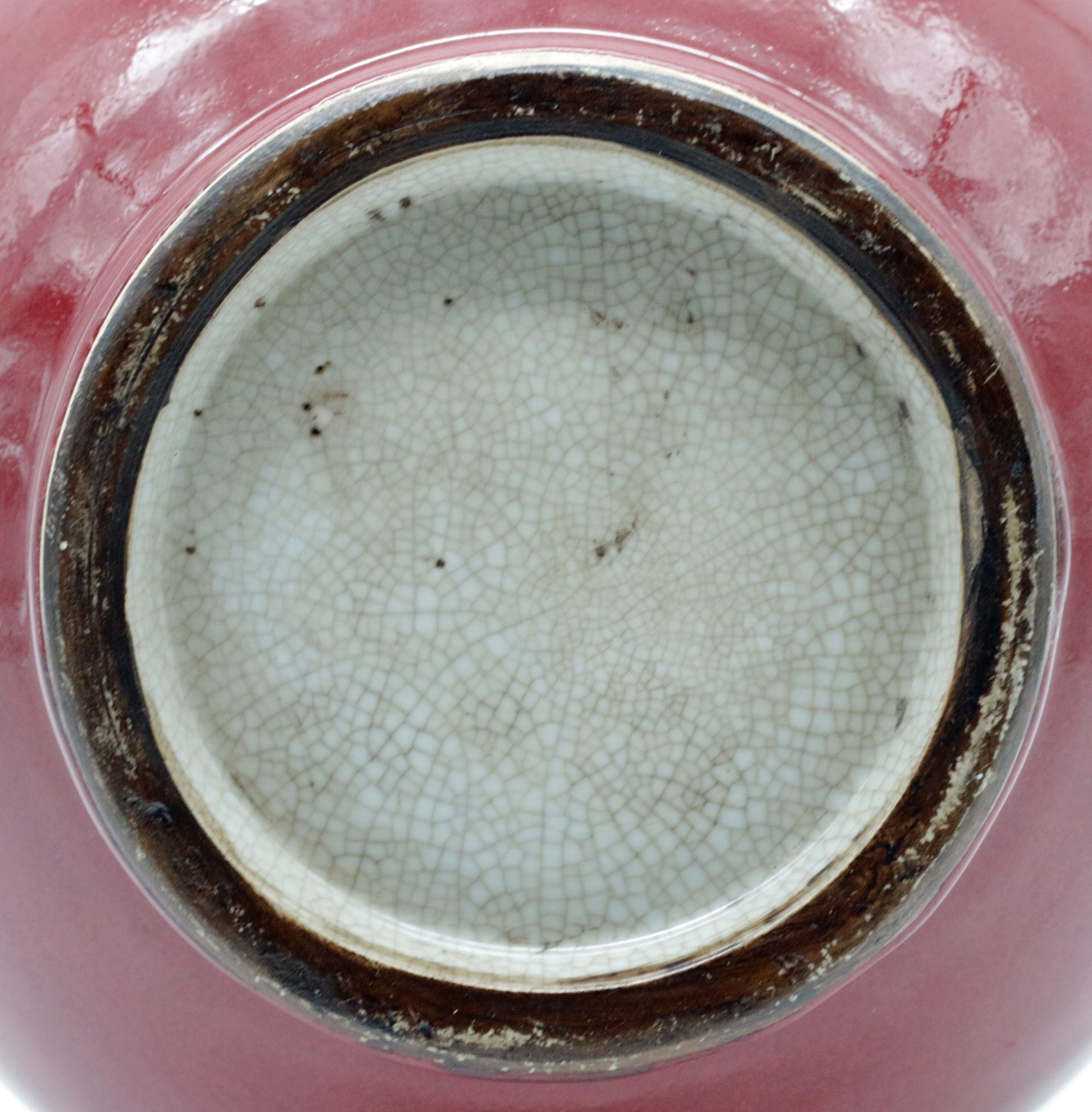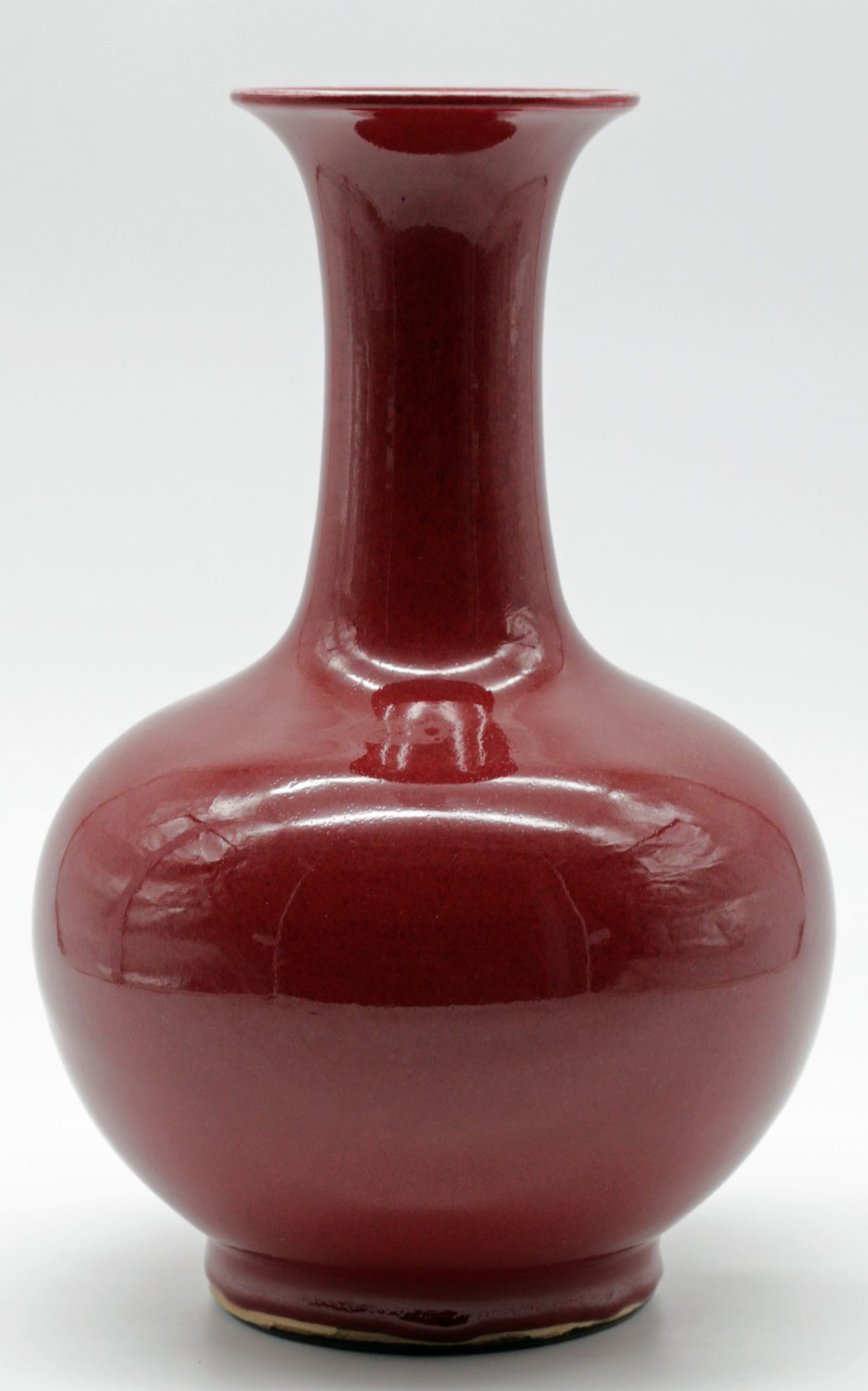 OverviewChinese porcelain bottle vase featuring a sang de boeuf (oxblood) copper red glaze over a high fired body. Classic monochrome decorative arts form with broad rounded shoulder, cylindrical neck, and gently flared rim. The glaze stops above the foot, revealing the unglazed foot ring.Dating / BackgroundSang de boeuf, or oxblood glaze, originates in earlier Chinese dynasties and was revived in later workshop production. This example reflects Qing-inspired monochrome traditions and is most consistent with mid-20th century Chinese production, circa 1950-1980. No reign mark present.Why CollectCopper red glazes are technically complex and highly prized for their depth of tone and firing variation. This example offers strong decorative presence, substantial weight, and classic bottle proportions suitable for collectors of Chinese ceramics or refined interior display.DimensionsHeight: 12 1/4 inchesWidth: 8 inchesDepth: 8 inchesWeight: 5.4 lbsConditionVery good overall. Minor surface wear consistent with handling. Light glaze variation at the foot rim. No visible cracks or restorations observed.