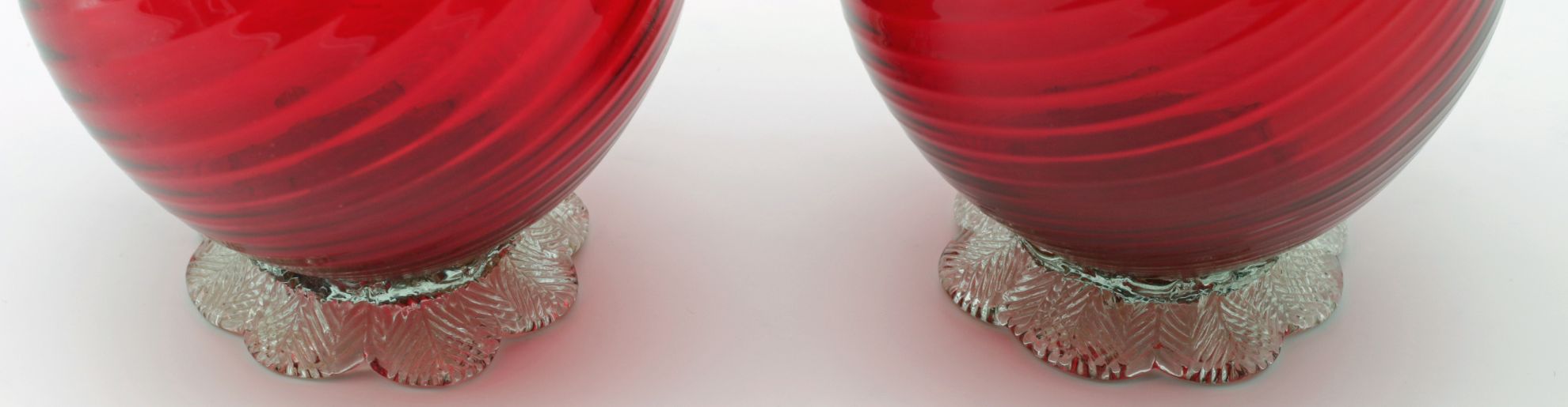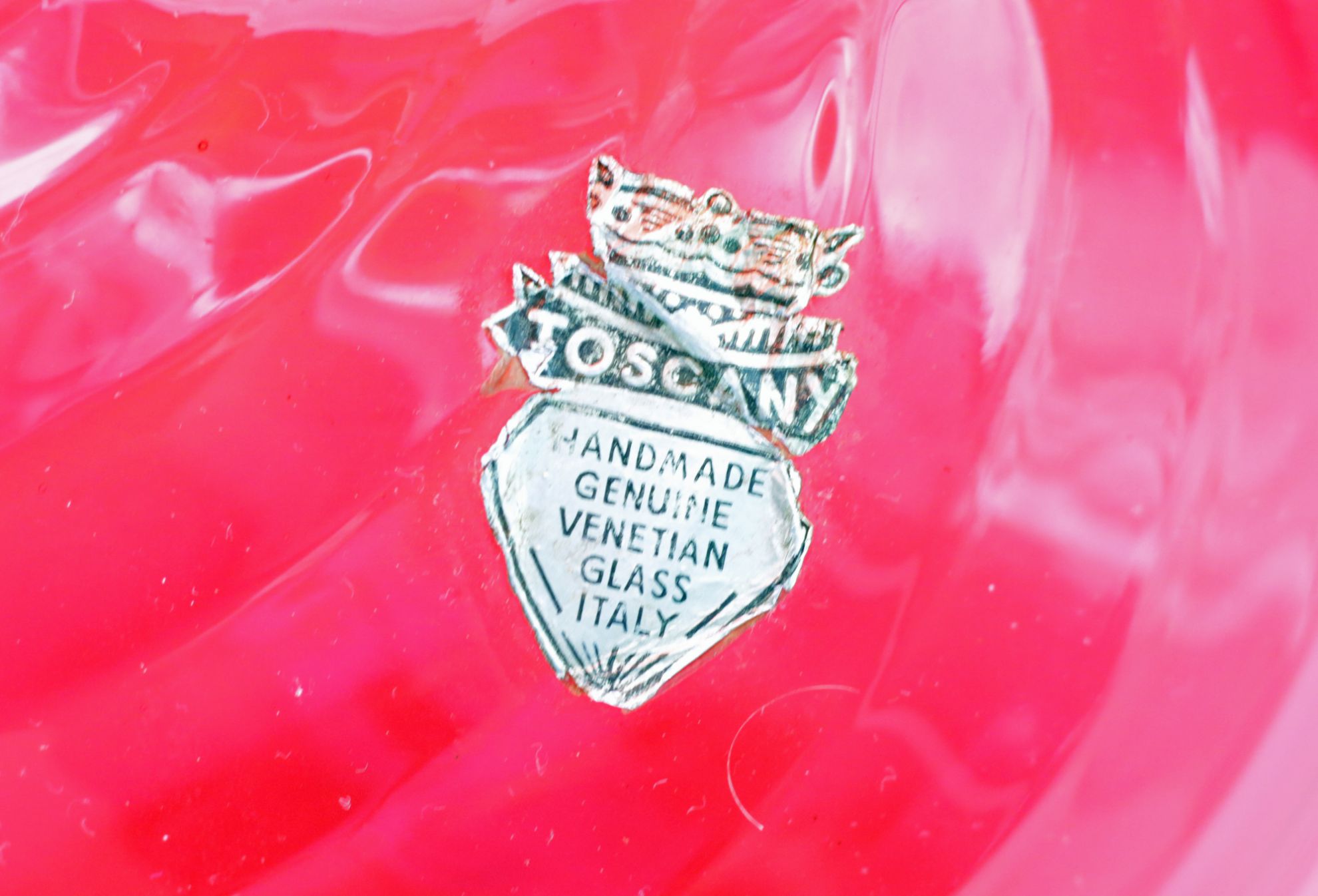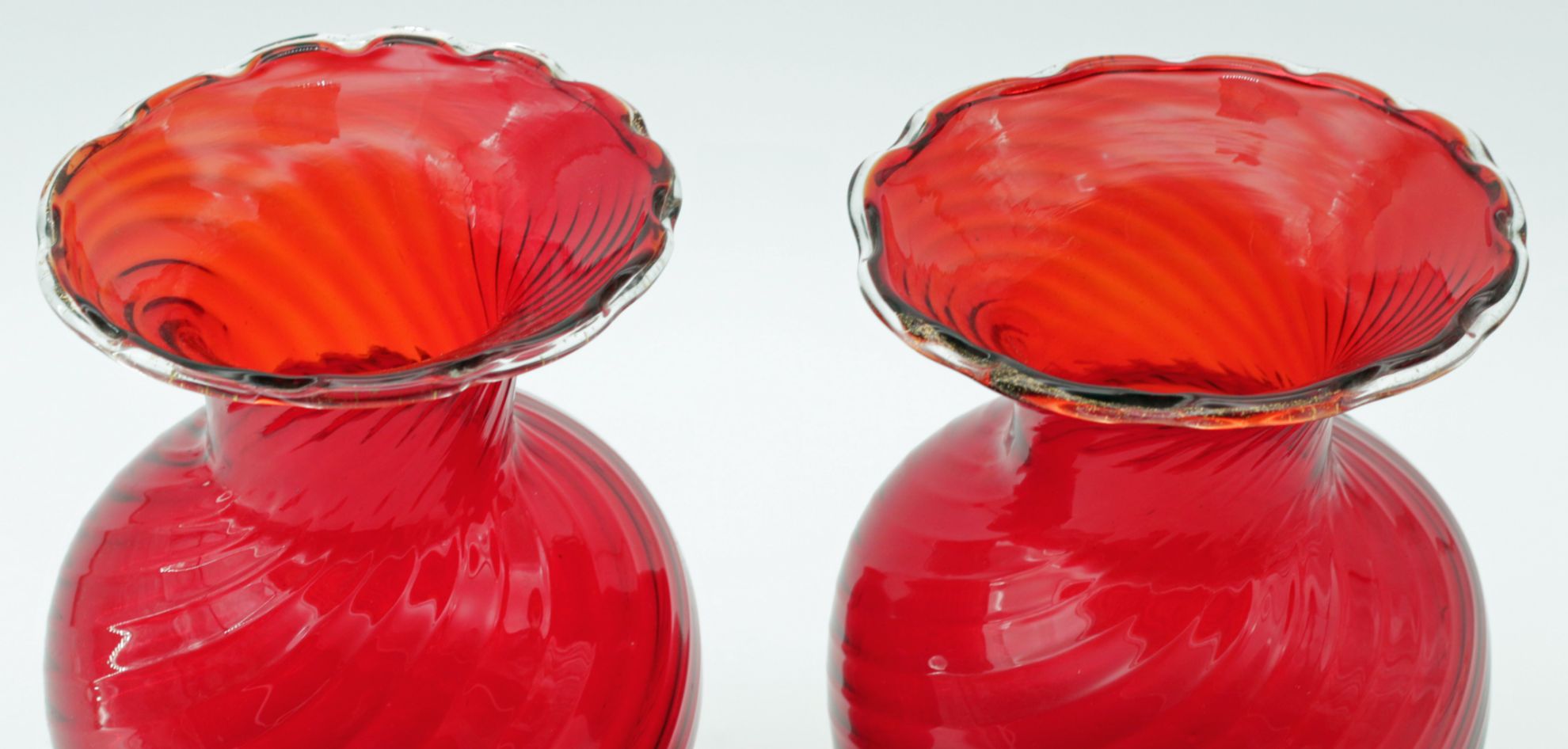 OverviewPair of Venetian ruby red glass vases, likely Murano production, executed in blown glass with a clean, sculptural mid-century modern form. The saturated red coloration and smooth surface reflect traditional Venetian glassmaking techniques adapted to modern decorative design.Dating / BackgroundMurano glassmakers in the mid-20th century produced a wide range of colored art glass, including deeply saturated ruby tones achieved through gold-based glass formulas. These works often combined centuries-old Venetian techniques with modernist forms intended for international export markets.Why CollectStrong visual impact through color and form. Representative of mid-century Venetian glass design. Versatile for display as a pair or individually. Continued collector interest in Murano and Venetian art glass.DimensionsHeight: approx 8-10 inches eachWidth: approx 3-4 inches eachConditionGood overall condition with light wear consistent with age and use. No major cracks or repairs observed. Minor surface wear may be present.